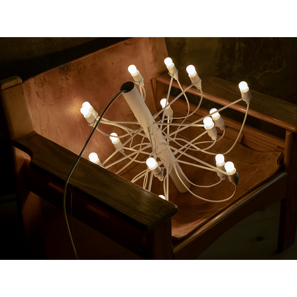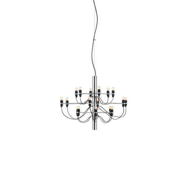 2097/30 (clear bulbs) Sarfatti er en lysekronen fra Flos har et ikonisk design med moderne, industrielle betoninger. Den har atten armer med dimmebare LED-lyskilder som sprer et diffust og omgivende lys. Den har en konstruksjon i stål med armer i messing og en lang ledning for fleksibel opphengning. Egnet til både private og offentlige omgivelser.