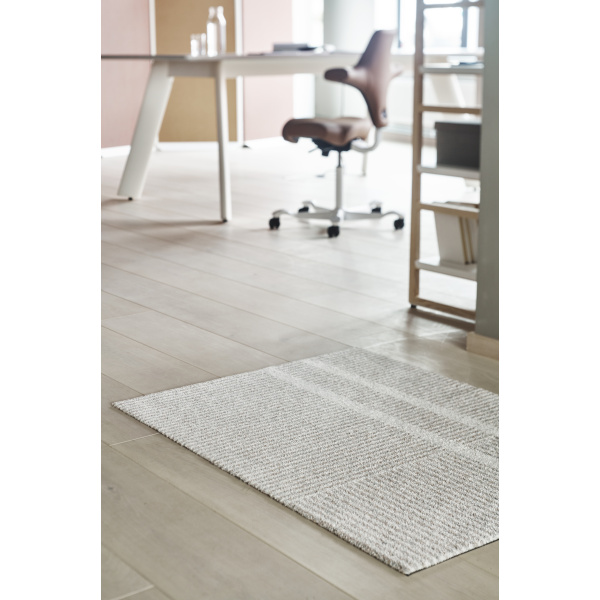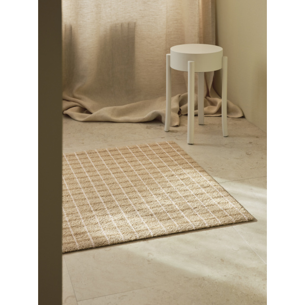 Løype Breezy Beige er inspirert av langrennssportens nypreparerte løyper. Et skispor krysser matten i et enkelt og grafisk mønster, som danner et nydelig spill mellom lys og skygge. Resultatet er både klassisk og moderne, hvor melerte nyanser gjør matten praktisk med hensyn til smuss og støv. Et godt hverdagsobjekt! Mattene er designet av Vera & Kyte.