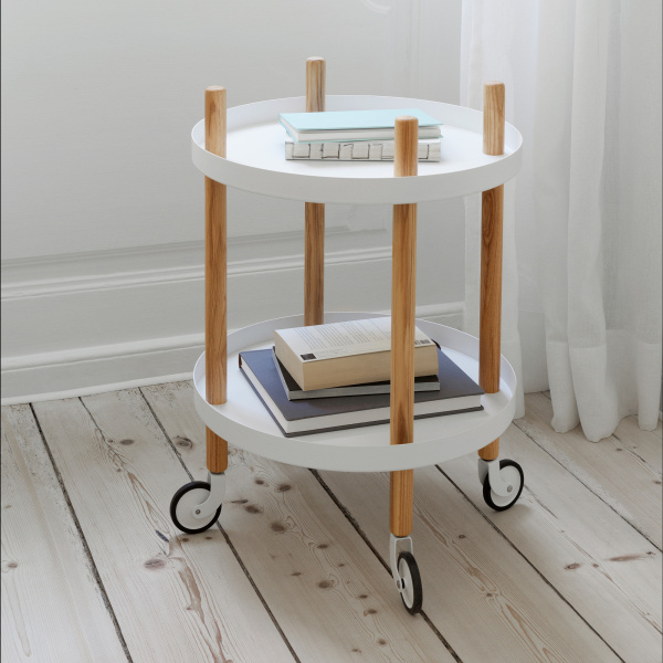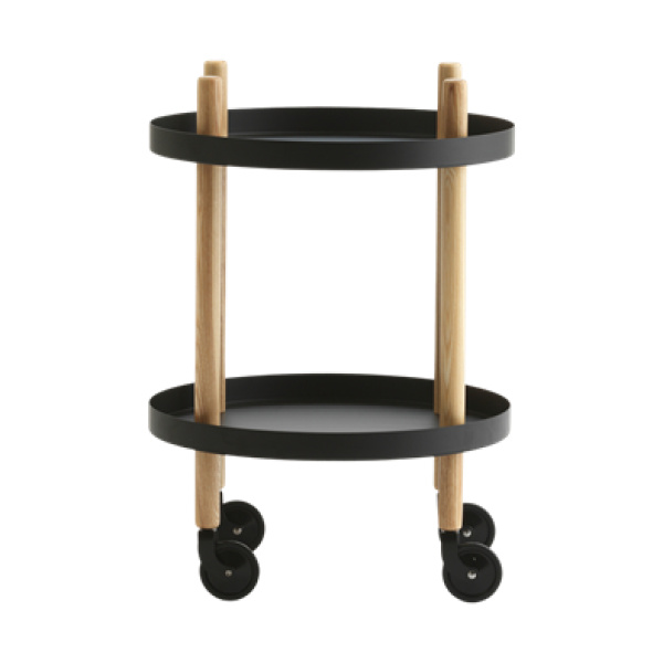 Block Table Ø45 cm, designet av Simon Legald for Normann Copenhagen, er et allsidig møbel som passer inn i de fleste miljøer. Bordet har hjul som er nøye fargetilpasset til flisene og kan rotere 360° for enkel manøvrering. En svart nylonring rundt hjulene gir bedre grep og økt stabilitet, slik at bordet står stødig under bruk. De integrerte håndtakene gjør det enkelt å flytte bordet mellom rom, og det leveres flatpakket med monteringsanvisning for enkel montering. Hver hylle tåler opptil 10 kg, noe som gjør bordet både praktisk og funksjonelt i mange ulike sammenhenger.