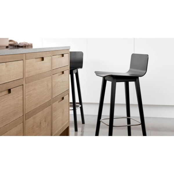 Stolen har lett skrånende ben og en høy ryggstøtte i støpt finér, utformet for å gi optimal sittekomfort. Ryggstøtten består av tre buede ryggstykker som følger kroppens form og gir god støtte. De horisontale linjene tilfører et skulpturelt og karakteristisk preg, som gjør stolen like vakker fra baksiden som forfra.