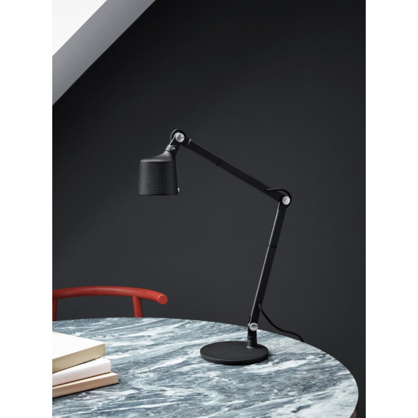 Vipp skrivebordslampe er en arbeidslampe for kontoret eller hjemmet. Den er utstyrt med en justerbar arm, fingerskruer og en solid base for stabilitet. skrivebordslampen har en perforert skjerm og matt glass for en behagelig lysspredning.