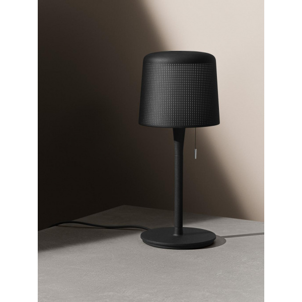 Vipp bordlampen egner seg optimalt til stua eller soverommet. Den er utstyrt med en tråd til å trekke i samt en solid fot som sikrer stabilitet. En innebygd reflektor fører lyset rett nedover, og den perforerte lampeskjermen gjør lyset mykt og behagelig, noe som gjør at lampen passer utmerket på nattbordet eller på et skatoll.