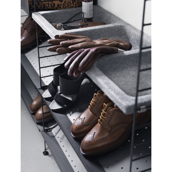 kr 1.980.00Skålhyllen i filt finnes i en bredde, 78 cm, og en dybde, 30 cm. Skålhyllen passer inn i alle 30 cm dype tråd- og plexpaneler fra String® System. Ved å legge til en bollehylle i filt til gangkombinasjonen din, legger du umiddelbart til et gitt sted for nøkler, hansker og slikt. De innvendige målene for hver skål (tre totalt) er: b20 x d22 x h4,5 cm. Hver emballasje inneholder én skålhylle i filt og en ramme sammen med braketter. Fargealternativene er beige, lysegrå og antrasitt.