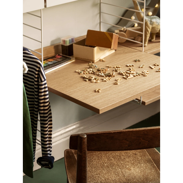 Arbeidspulten er tilgjengelig i én størrelse, 78x58 cm og passer inn i trådpaneler fra String® System med dybde 30 cm. Skrivebordet kan enkelt justeres til ønsket høyde og kan brukes på et kontor, kjøkken, gang eller et hvilket som helst annet rom der du måtte ha behov for et ekstra bord. Gjør arbeidsområdet komplett ved å montere en arbeidsskuff under skrivebordet der du kan oppbevare penner, notatbøker og lignende. Hver emballasje inneholder ett skrivebord, en avsats til å plassere mot veggen for å stabilisere skrivebordet sammen med braketter. Velg mellom ulike farger og tresorter.