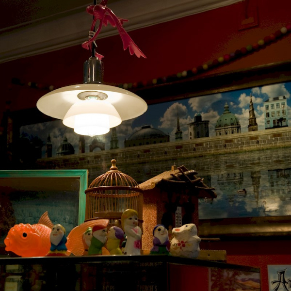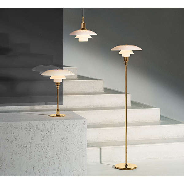 Louis Poulsen. PH 3/2 Academy - Poul Henningsen - PH så for seg at man i en restaurant ville ønske å ha et varmt og koselig lys, og benyttet derfor en gullfarget flate, i motsetning til et sykehus eller et tannlege kontor der man ville benytte hvitmalt flate. De første lampene hadde alle metallskjermer, men PH ønsket også å utvikle en variant av lampen som kunne gir en lysdistribusjon med mindre nedadrettet lys. Resultatet var skjermer laget av opalglass med en sandblåst underside. Glasskjermene tillot 12 % av lyset å trenge igejnnom og bidro til det generelle lyset i rommet mens det meste av lyset ble reflekteret ut og ned fra skjermenes matte underside. De samme prinsippene som styrte de matte metallskjermene styrte også dette nye skjermmaterialet. PH-lampene ble designet som et rasjonelt lyssystem der størrelsen på skjermen, materialet og dens flater kunne kombineres innbyrdes avhengig av hvor de skulle plasseres. Hver toppskjermstørrelse hadde et tilsvarende sett med midt- og bunnskjermer slik at proporsjonene mellom skjermene var omtrent 3:2:1. En av de klassiske modellene helt fra starten var PH 5/5. Det første tallet i fraksjonen indikerte toppskjermens omtrentlige diameter, og tallet etter skråstreken indikerte at midt- og bunnskjermene var "født" til denne bestemte toppskjermen. Dette betyr at 5/5 hadde en toppskjerm med en diameter på 50 cm, en midtskjerm på 31 cm og en bunnskjerm på 16,5 cm. Denne kombinasjonen var god når lampen skulle henges høyt, men dersom hengelampen skulle henges lavere var det mer passende med en stor toppskjerm og mindre midt- og bunnskjermer. Slik ble PH 2/1 eller 3/2 født. Systemet PH 3-skjerm startet som en hengelampe men utviklet seg raskt til andre typer lamper for bord, gulv, vegger og en rekke ulike lysekroner. Bruken av forskjellige størrelser, materialer, flater, farger og lyskilder har ført til utviklingen av over tusen varianter gjennom årene.