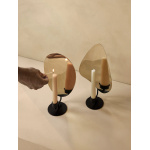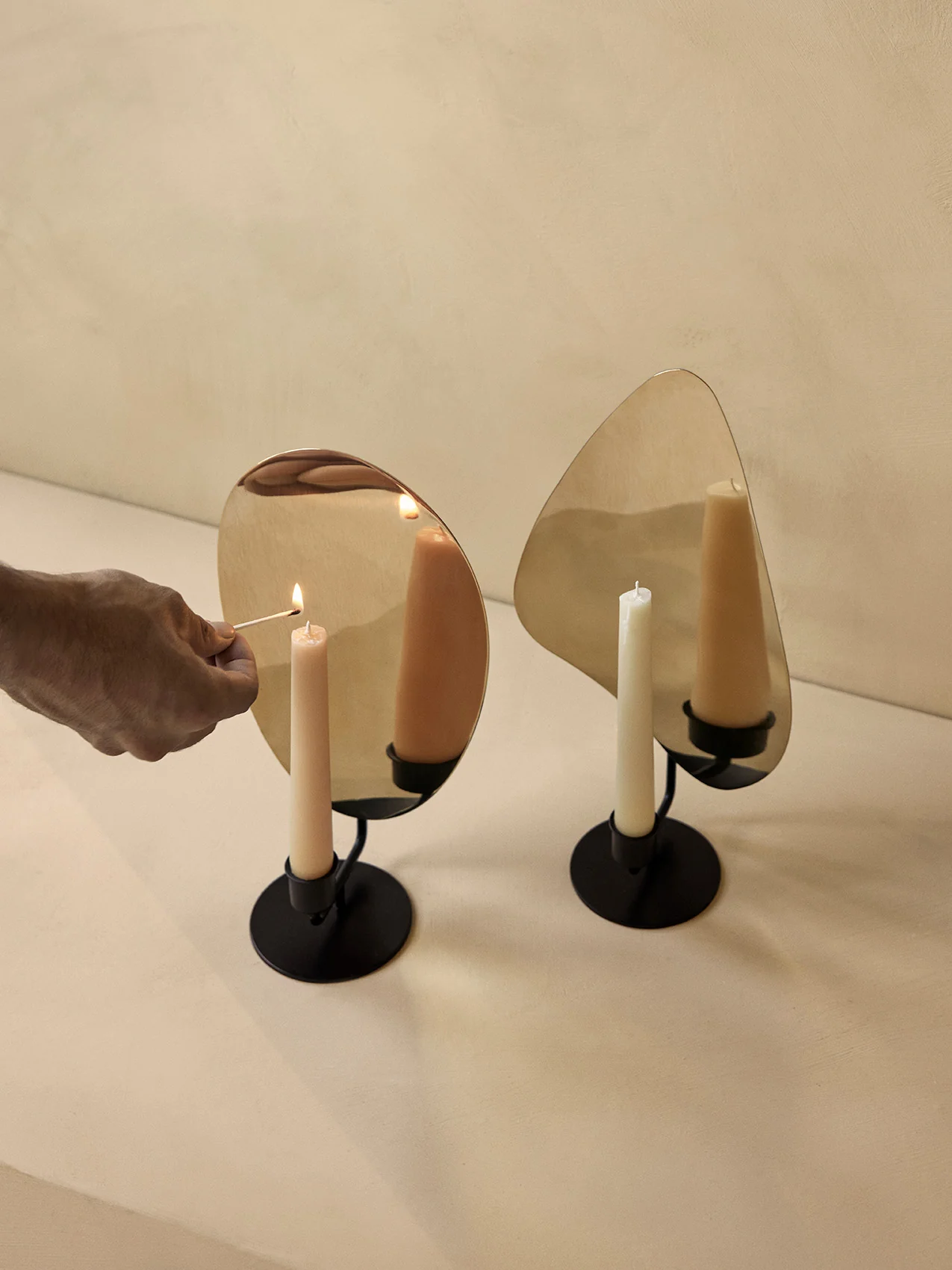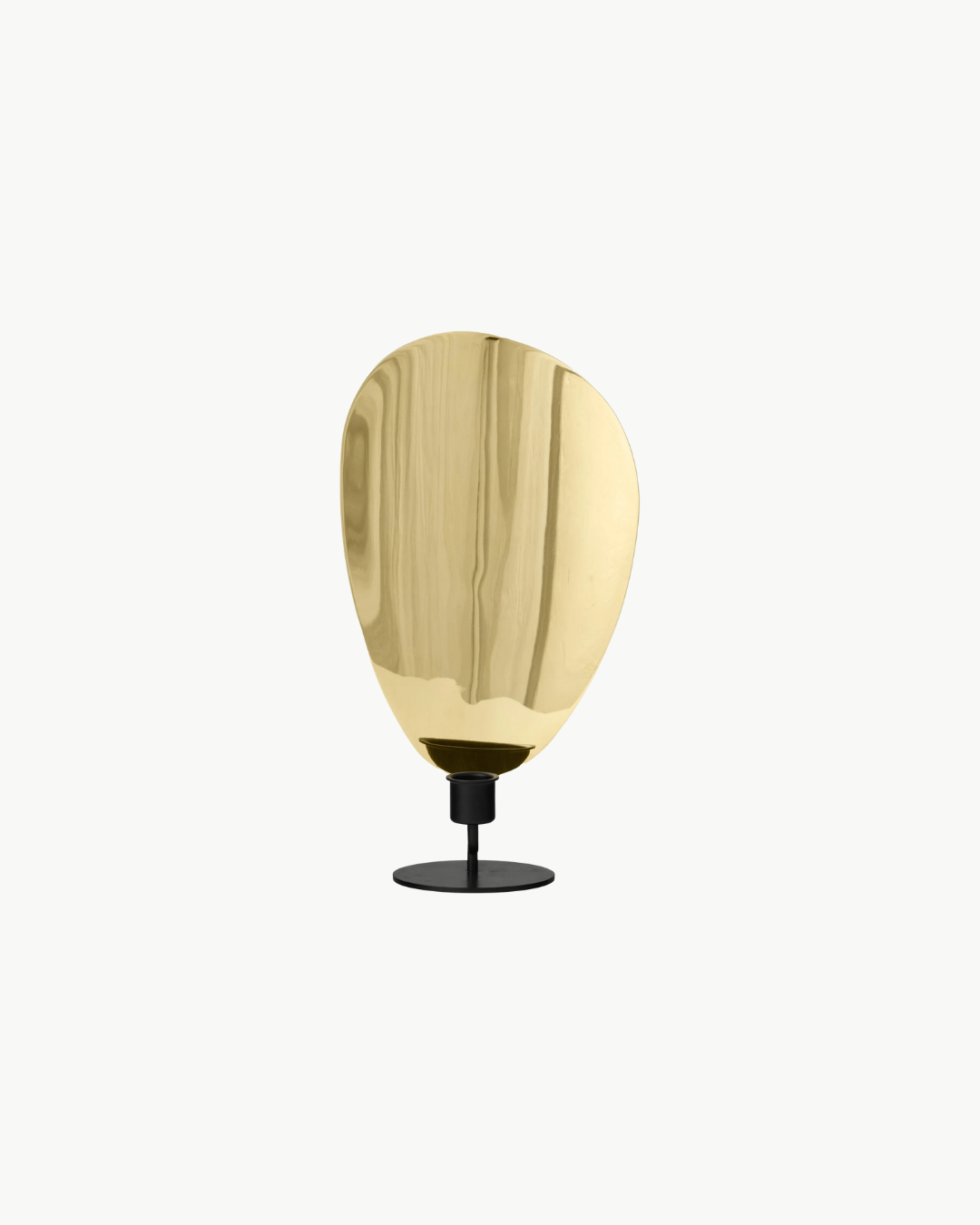 Flambeau Candle Holder, Table er en lysestake som er inspirert av franske lysarmaturer og er designet for å ligne en levende flamme. Metallplaten forstørrer og reflekterer lyset, noe som skaper spennende skygger og et vakkert lysspill.