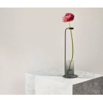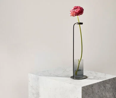 Échasse-vasen—Det første stykket i den nå ikoniske samlingen ble inspirert av laboratorieprøverør. Den dråpeformede formen er like elegant når du holder blomster på et skrivebord, stuegulv, eller lar det være ufylt. Versjonen med røkt glass med ben i børstet messing er tilgjengelig i tre størrelser. De unike fargegradientene til glasset gir designet dybde og kontrast mot benas rene linjer. Den minste vasen er nå tilgjengelig med klart glass og bronserte messingben; en klassisk sammenkobling som komplementerer enhver interiørpalett, i en størrelse som er ideell for mer kompakte rom.