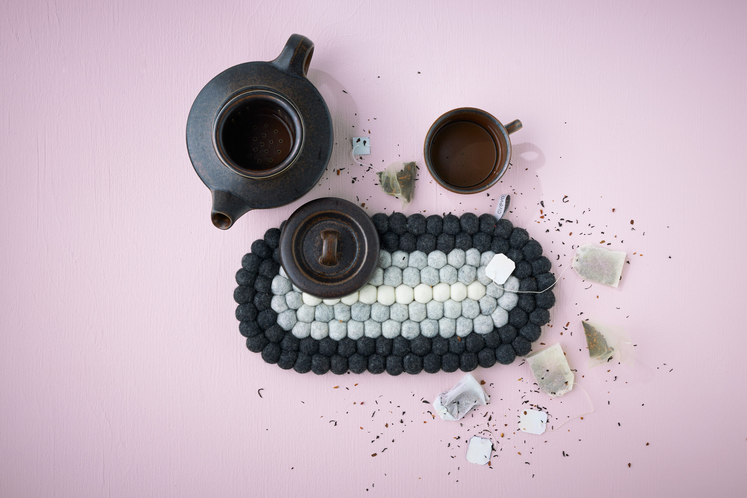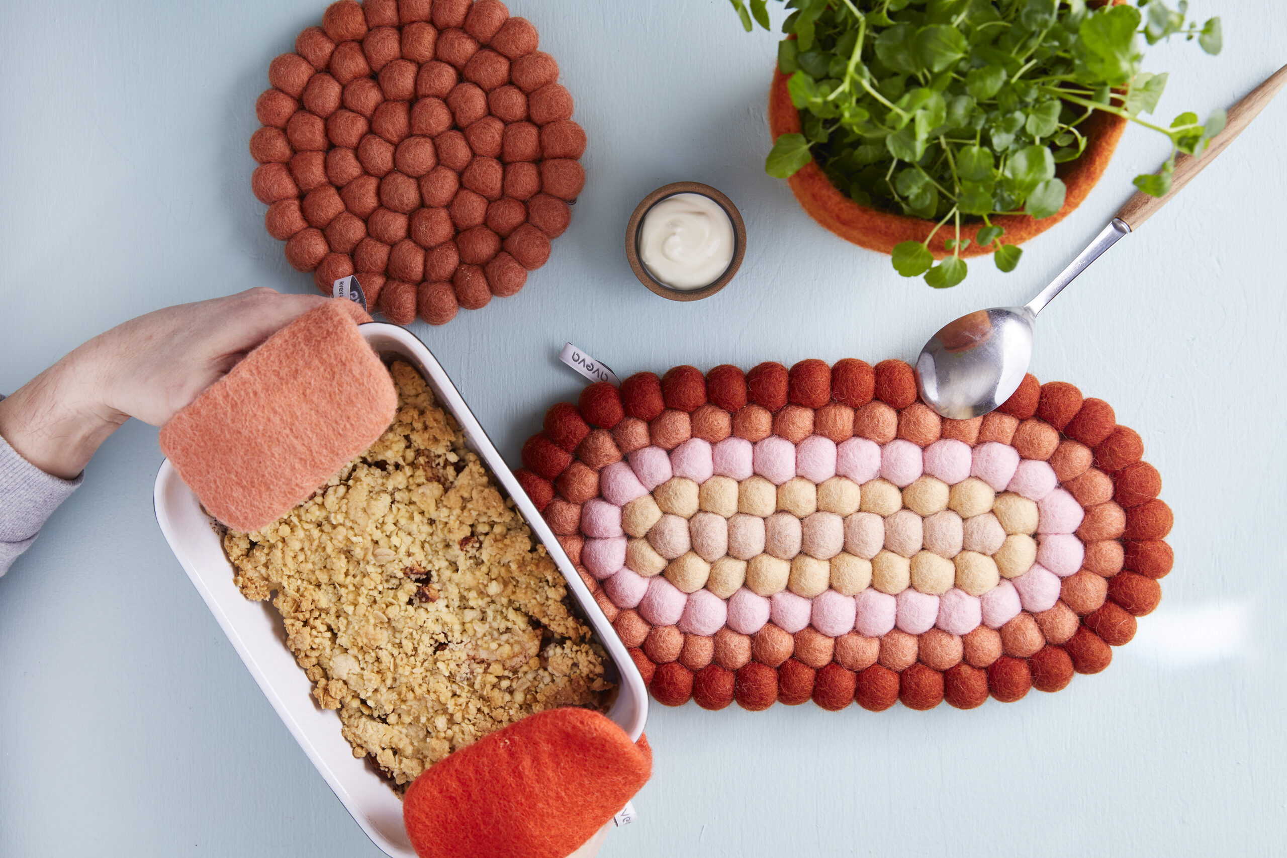 Aveva sine gryteunderlag er håndlaget av 100% ull som gir en myk og robust følelse. Som for alle deres ullprodukter, er dette understellet laget av høykvalitets ull, AZO-frie farger, og er naturlig varme- og smussbestandig. Avevas understell vil beskytte, dekorere og farge bordet og er designet for å ha lang levetid.