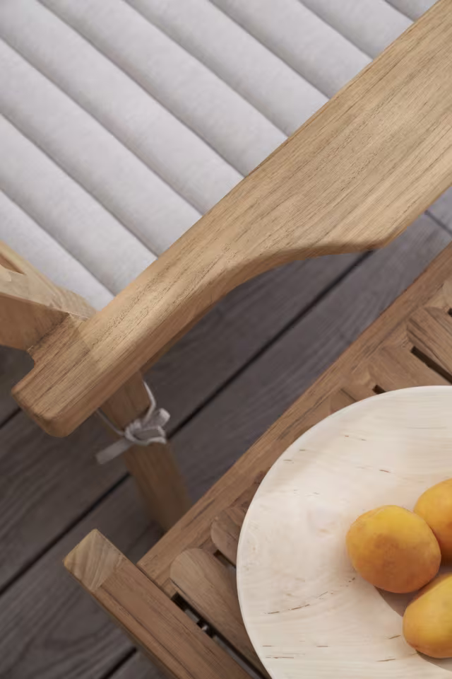 AH601 outdoor lenestol designet av Alfred Homann for Carl Hansen er laget av ubehandlet FSC-sertifisert teak som får en unik patina. Puter selges separat.