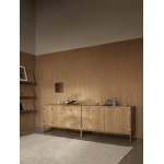 Tillater materialene å tale for seg selv, det er få dekorative blomstrer, bortsett fra slående messingbraketter med skruespalter som vender innover for å danne et enkelt, symmetrisk mønster. Designet med nok plass til å holde et spisestuesett i 12 deler, åpner to-foldedører ut for å avdekke to justerbare hyller, skuffer med skjøter og sidepaneler som smalner av på toppen for en slank finish. Slanke ben, som er en sømløs del av en solid eikramme, løfter skjenken opp fra bakken og gir den en letthet som ikke forringer plassen rundt den.