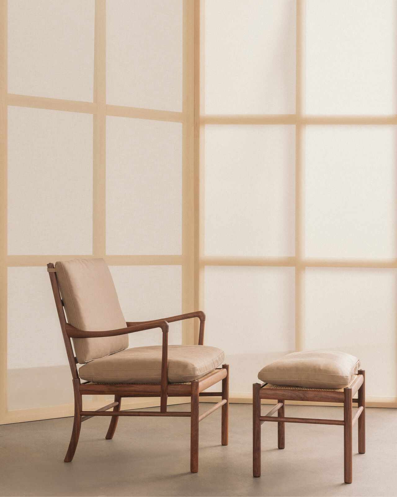 Femten år senere utviklet Wanscher den matchende Colonial Sofa og Colonial Coffee Table, som sammen utgjør den eksklusive Colonial-serien. Colonial Chair kan også kombineres med den matchende OW149F Colonial Footstool for ekstra komfort og avslapning.