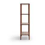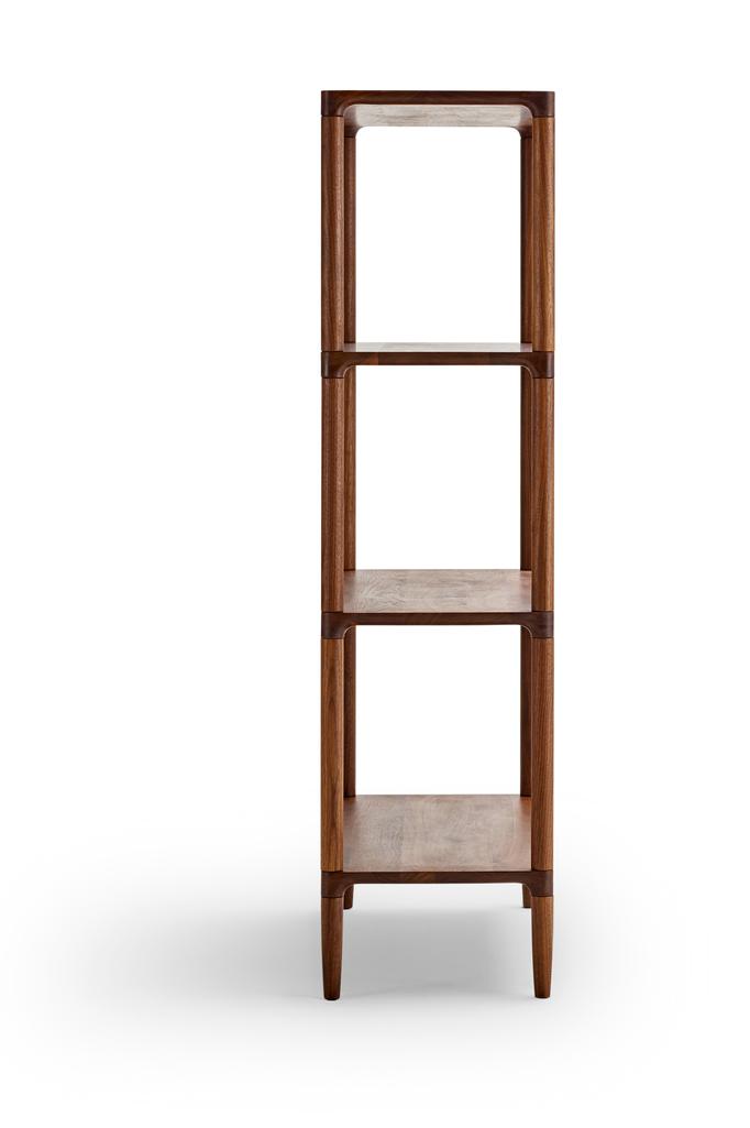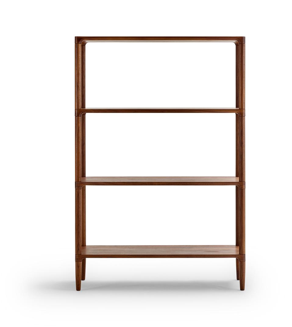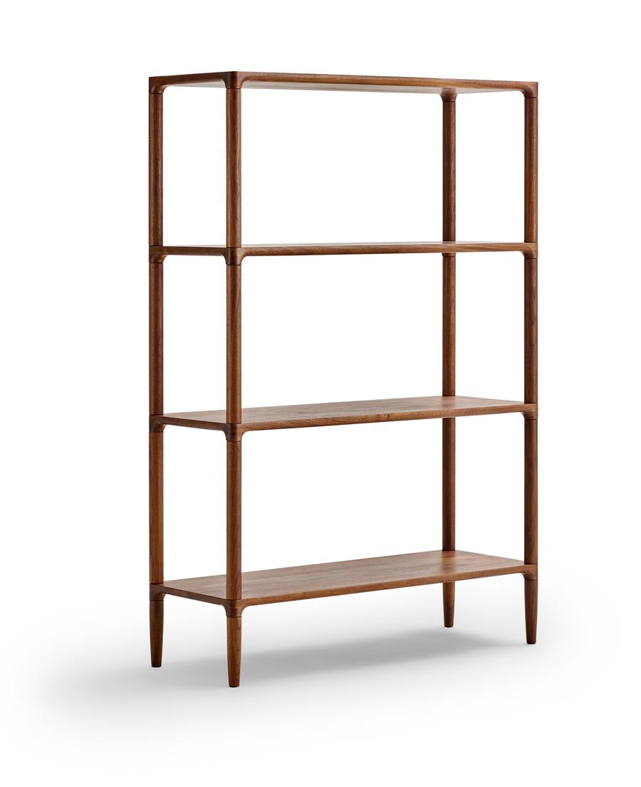 Bokhyllen skiller seg ut som et solid tre-møbel som du ikke kan motstå å la fingrene gli over de avrundede kantene på.