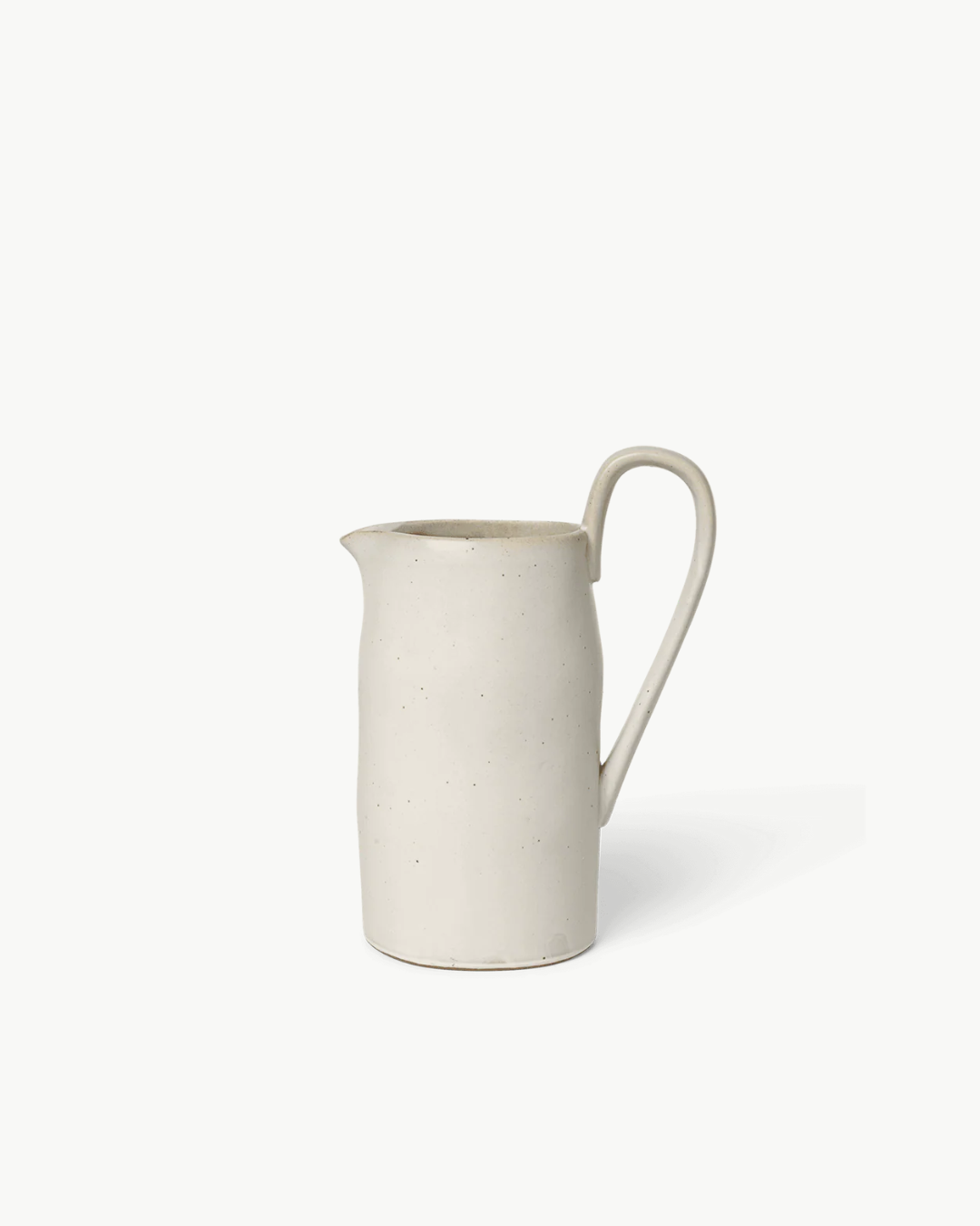 Flow Jug fra Ferm Living er en keramikk‑vase eller kanne med minimalistisk, skulpturell form og myke, organiske linjer. Den off‑white fargen med subtile speckles gir et rolig, tidløst uttrykk, og kannen fungerer både som vannkanne, vase eller dekorativt element på bordet. Hvert produkt har små variasjoner på grunn av håndlaget produksjon.