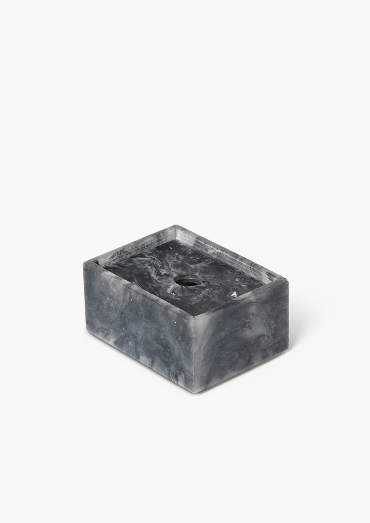 Dette er en del av Mist-serien fra Ferm Living: en kompakt, skulpturell boks i resin med virvlende mønster i mørk “Charcoal”-tone. Formen er interaktiv og kan stables med andre Mist-deler, noe som gjør den både praktisk og dekorativ.