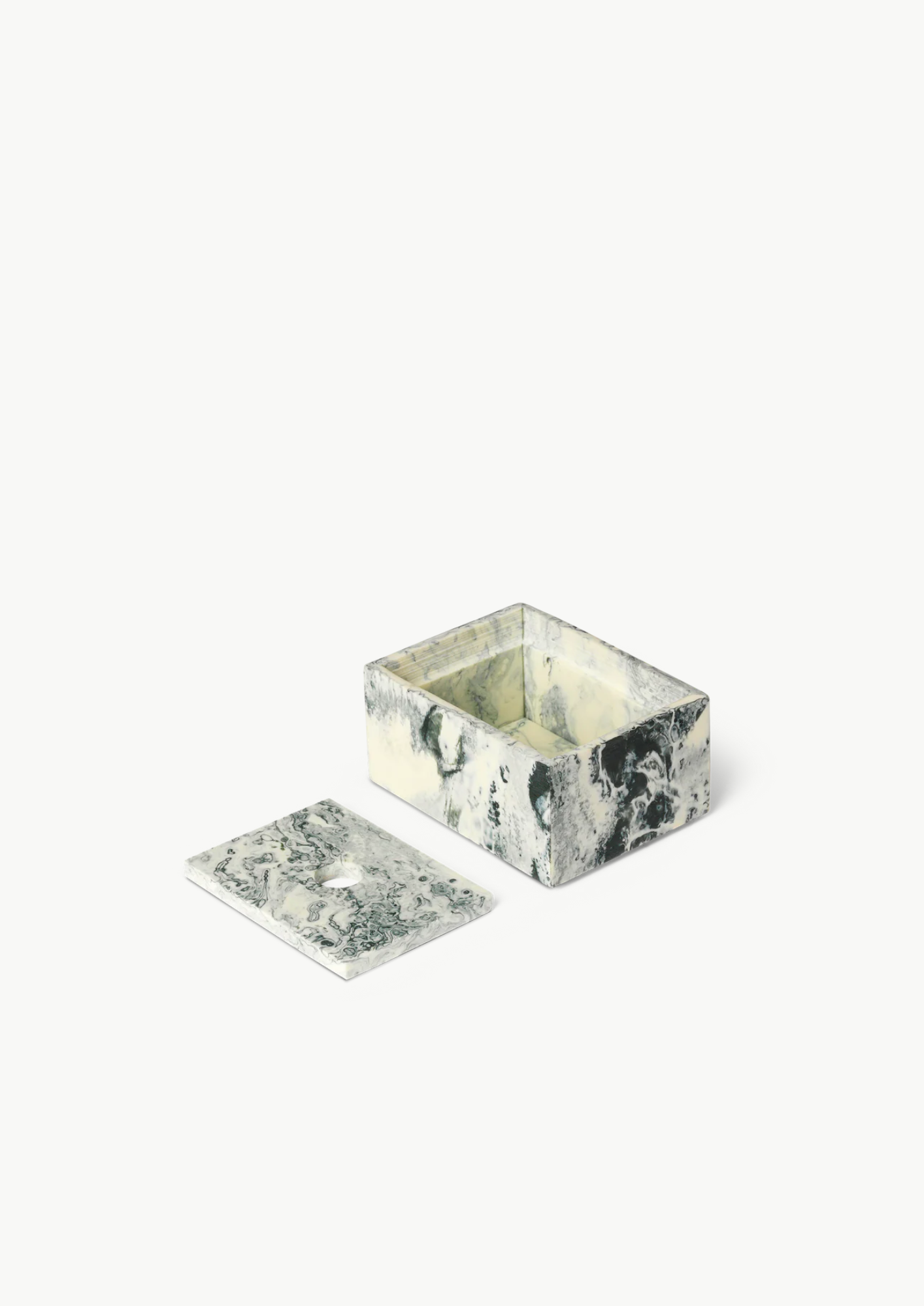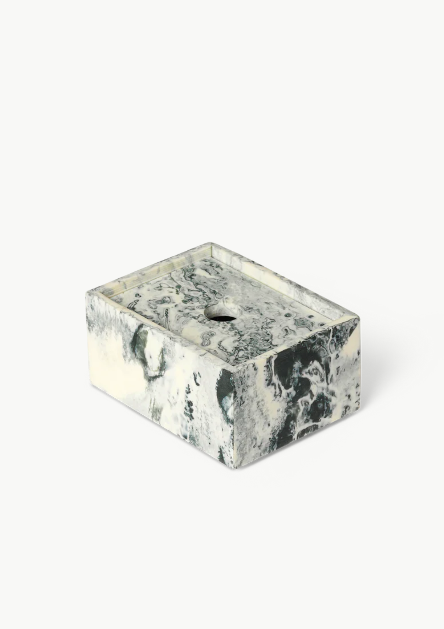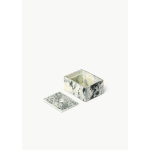 Mist Box fra Ferm Living er en liten, kunstnerisk oppbevaringsboks i resin, med et flytende marmorert mønster i smaragdgrønt og off-white. Boksen kan stables og kombineres med andre biter fra Mist-serien, og fungerer både som en dekorativ oppbevaringsløsning for smykker, småting eller som en estetisk detalj på skrivebordet eller baderomshyllen.
