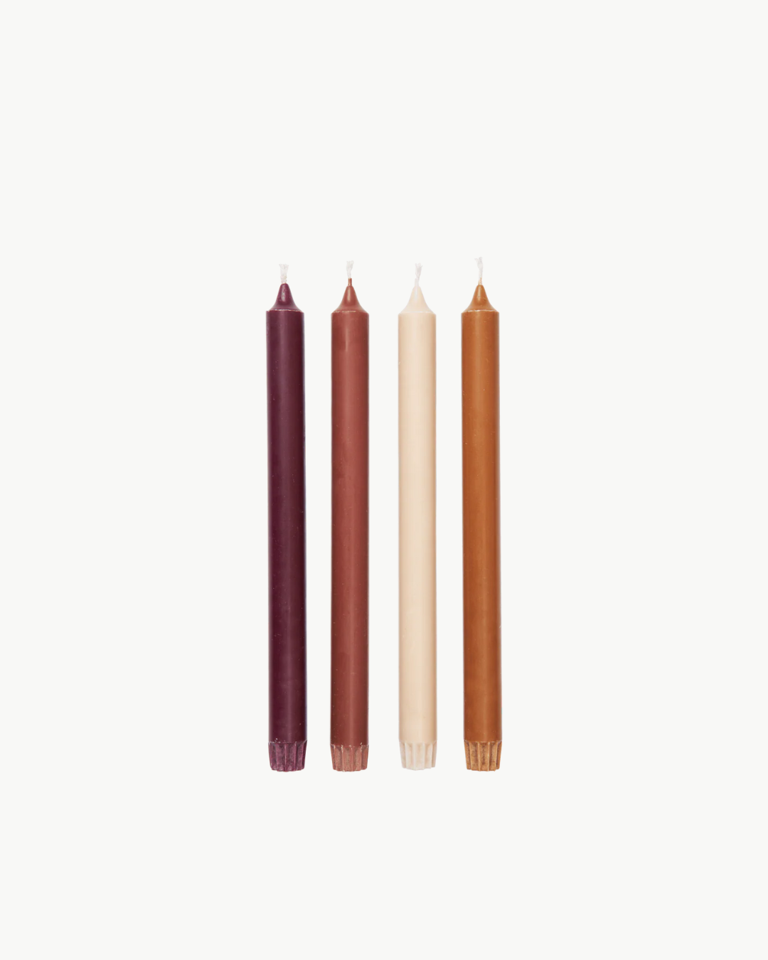 Pure Candles fra Ferm Living er et sett med fire enkle lys med uniform farge og rolig uttrykk. Disse rene stearinlysene tilfører varme og stemning uten å stjele fokus fra andre dekorative elementer. Perfekt for bruk i lysestaker, som bordpynt eller til hverdagslige stemningsskapende øyeblikk.
