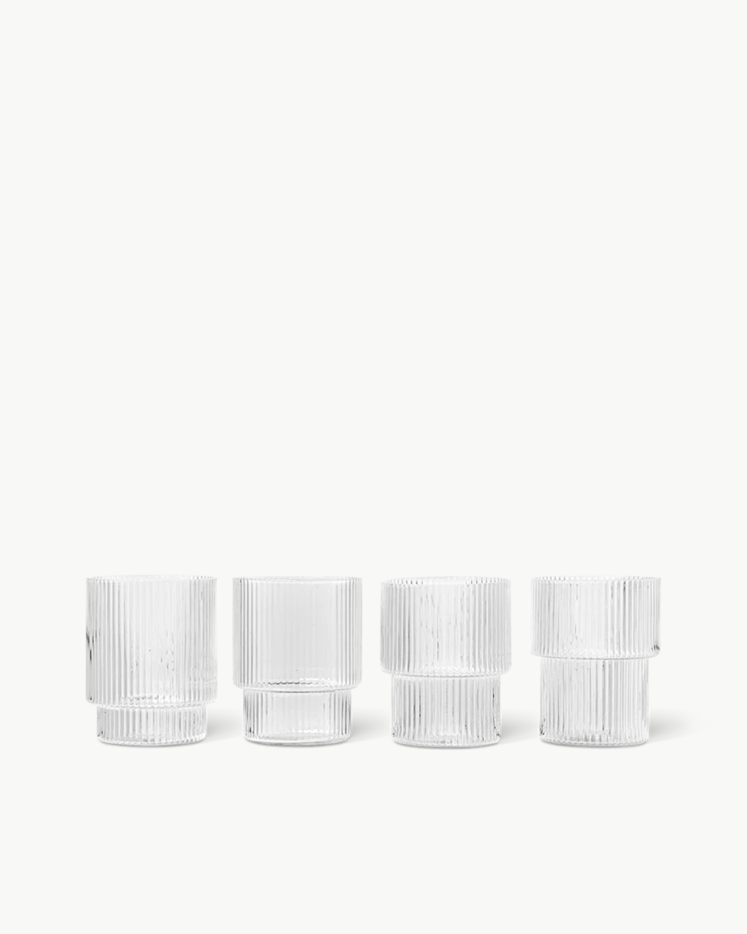 Ripple Glasses fra Ferm Living er et sett med fire munnblåste glass med det karakteristiske vertikale riflemønsteret. Den taktile overflaten gir et lekent lysspill og et godt grep, samtidig som glassene tilfører bordet et moderne og organisk uttrykk. Perfekt til vann, juice eller cocktail.