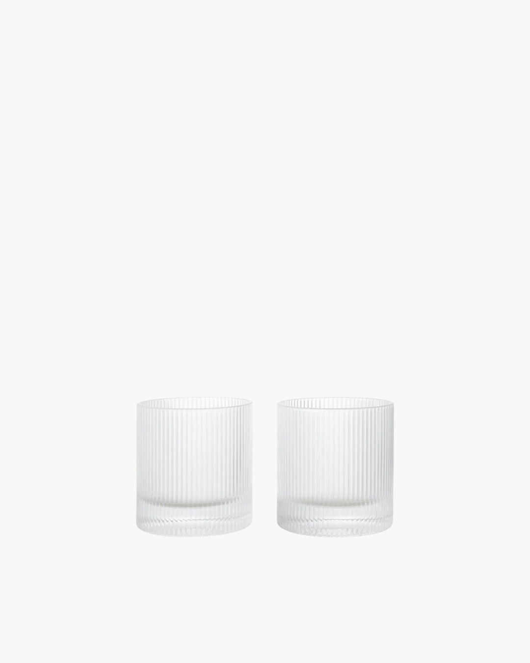 Ripple Tumbler Glasses fra Ferm Living er et sett med to munnblåste glass med det karakteristiske vertikale riflemønsteret. Den taktile overflaten gir et lekent lysspill og et godt grep, samtidig som glassene tilfører bordet et moderne og organisk uttrykk. Perfekt til vann, juice eller cocktail.