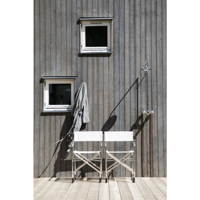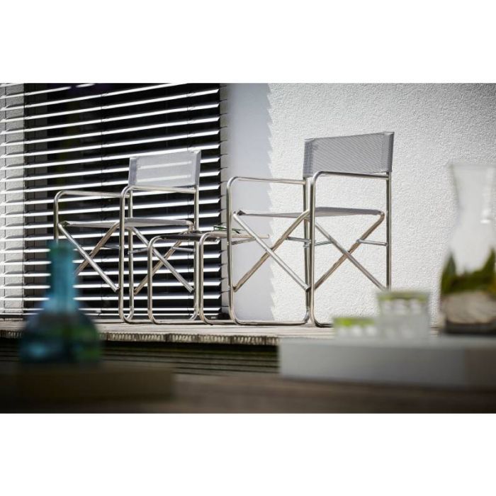 Regista er en lett regissør-stol med god sittekomfort. Dette er en perfekt stol til spisebordet både på balkong og terrasse. Den kan også brukes som reservestol, da den lett kan slås sammen og tar liten plass når den stues vekk. Regista er produsert i aluminium og texfil.