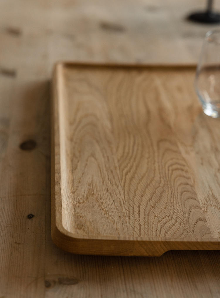 Et nydelig serveringsbrett i solid eik, tilgjengelig i naturlig eik og mørk eik.