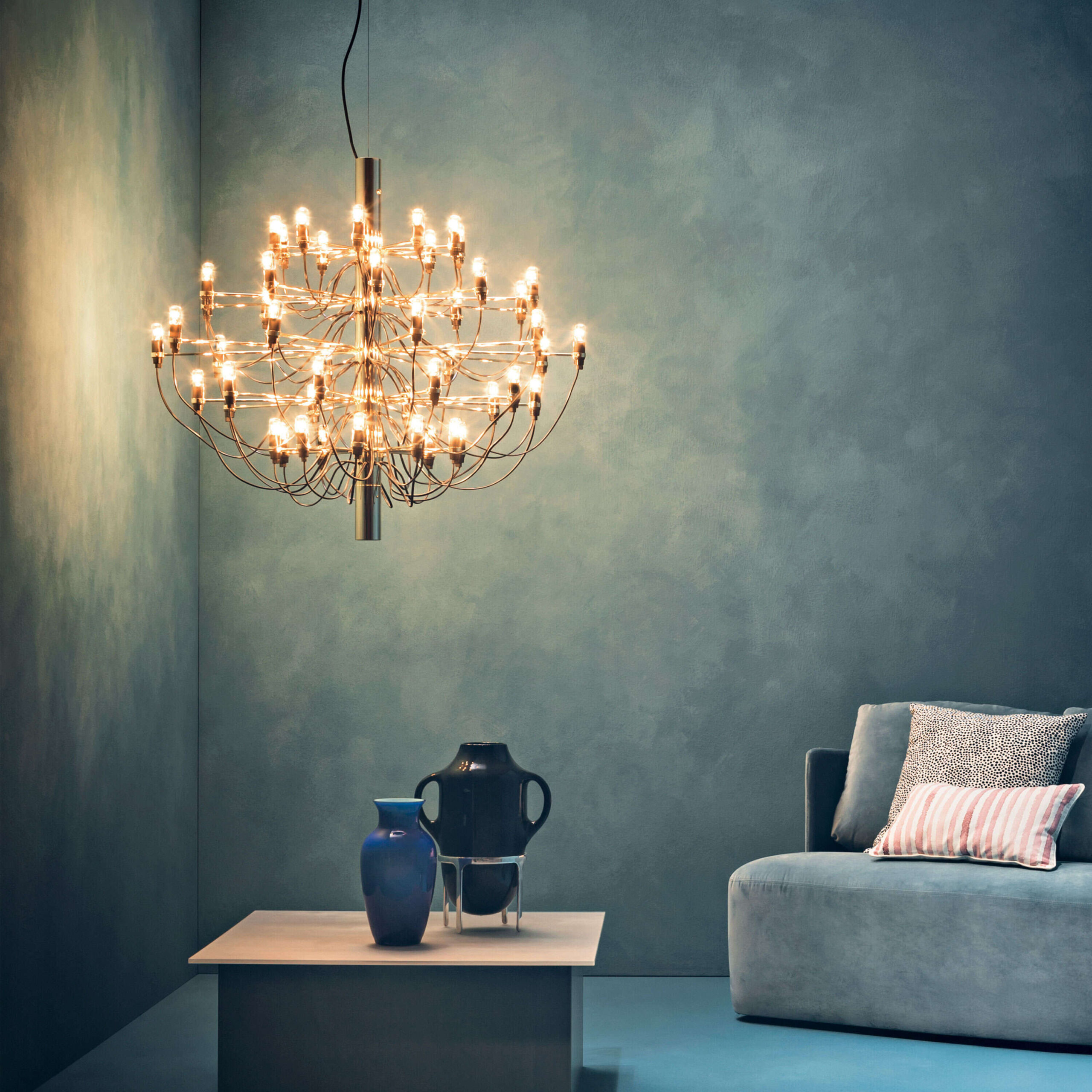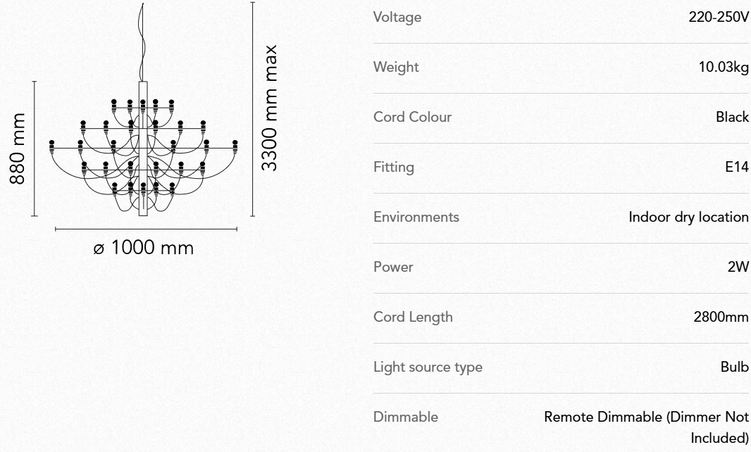 2097/50 (clear bulbs) Sarfatti er en lysekronen fra Flos har et ikonisk design med moderne, industrielle betoninger. Den har atten armer med dimmebare LED-lyskilder som sprer et diffust og omgivende lys. Den har en konstruksjon i stål med armer i messing og en lang ledning for fleksibel opphengning. Egnet til både private og offentlige omgivelser.