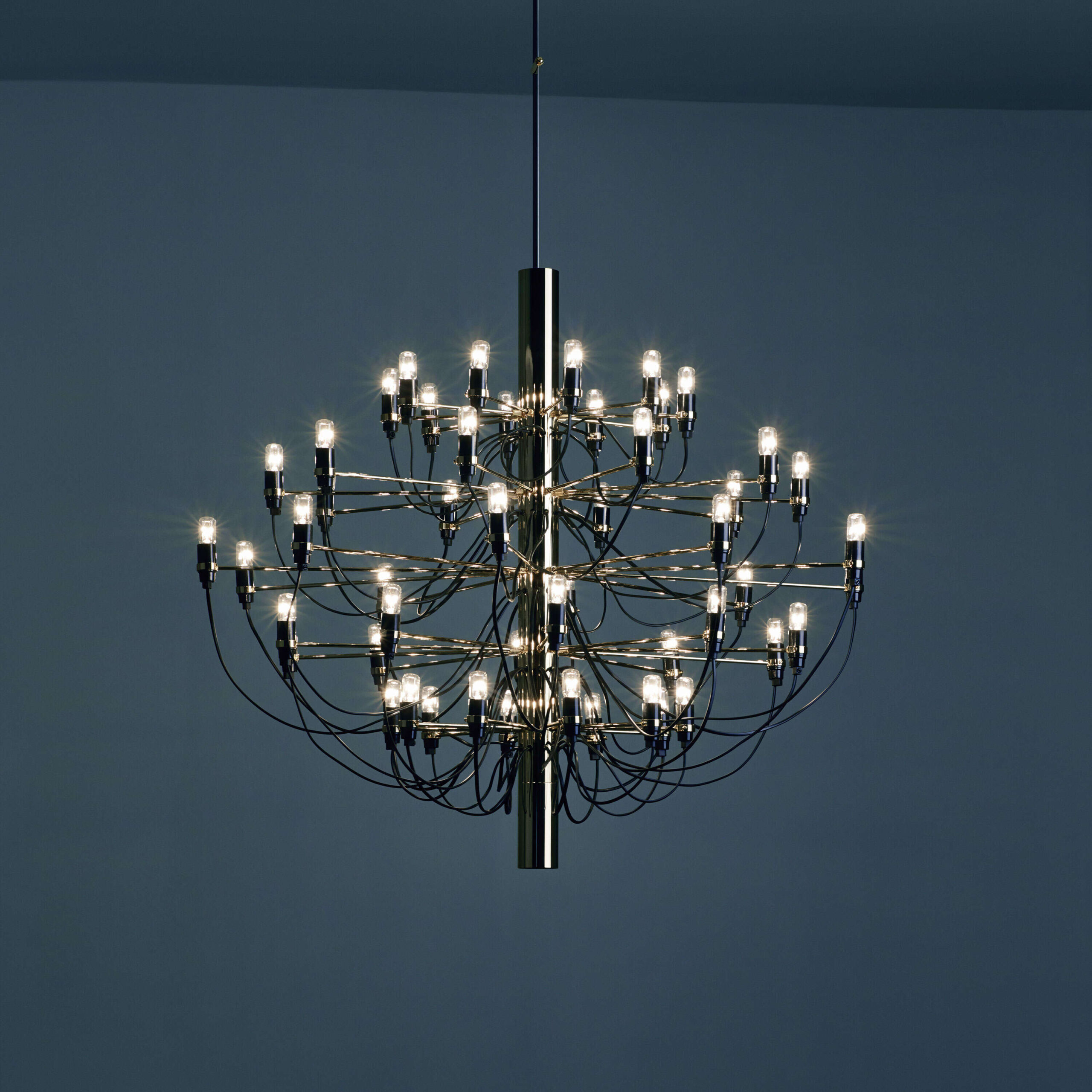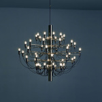 2097/50 (clear bulbs) Sarfatti er en lysekronen fra Flos har et ikonisk design med moderne, industrielle betoninger. Den har atten armer med dimmebare LED-lyskilder som sprer et diffust og omgivende lys. Den har en konstruksjon i stål med armer i messing og en lang ledning for fleksibel opphengning. Egnet til både private og offentlige omgivelser.
