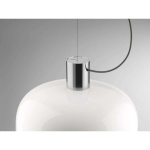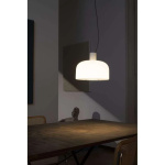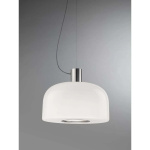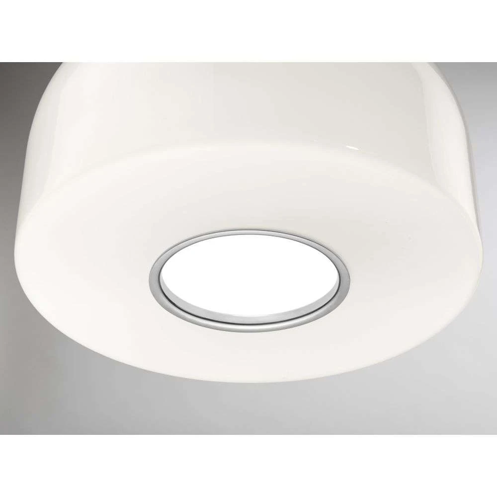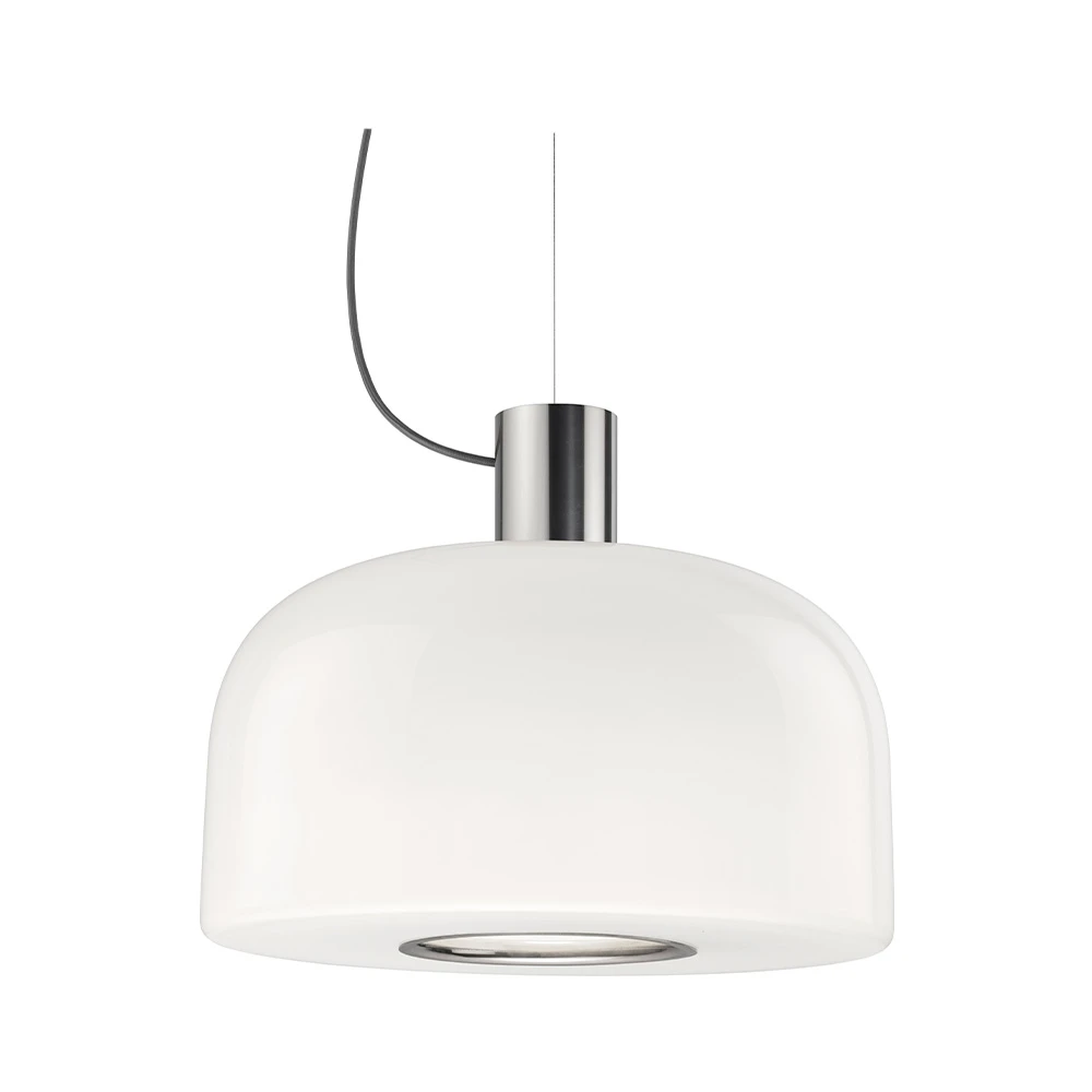 Bellhop Glass S2 bright aluminium pendellampe fra Flos er en elegant pendellampe som kombinerer funksjonalitet og stil. Lampen er laget av glass og aluminium, noe som gir den et moderne og sofistikert utseende. Med en diameter på 45 cm passer den perfekt over spisebordet eller i stuen, der den kan fungere både som stemningsbelysning og direkte arbeidsbelysning. Den unike konstruksjonen sørger for at lyset rettes presist mot underlaget uten å blende dem som sitter rundt bordet. Den smarte åpningen i bunnen, omgitt av en farget aluminiumsring, gjør det enkelt å skifte pære og sørger for at lyset ikke spres oppover.
