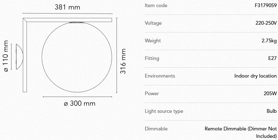 Velg mellom sort, messing og krom. Lampen er dimbar. Vi tilbyr også en mindre variant av lampen, IC C/W2, som er litt lavere.