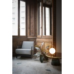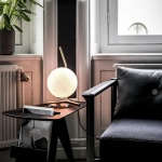 Bordlampen IC T1 lav sprer en diffus og myk glød og passer perfekt både i hjemmet og i offentlige miljøer. Lampen er laget av to håndblåste opalglass som balanserer på en stang bestående av enten messing eller stål.