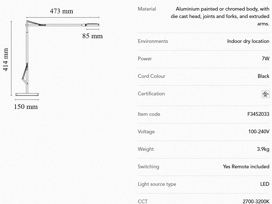Lampen har en integrert lyskilde, å kan dimmes i tre trinn. Du kan også stille inn lystemperaturen til 2700K eller 3200K. Lampen er laget av aluminium og er tilgjengelig i en rekke forskjellige farger og utførelser.