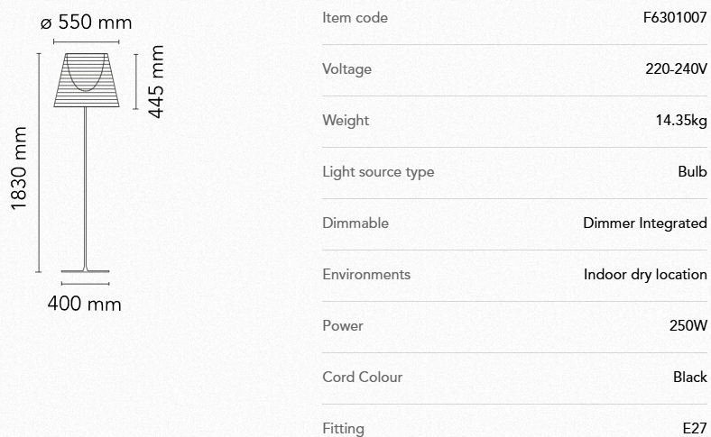 Produktet er laget i tre forskjellige gulvlampevarianter som gjerne kan kombineres med hverandre. I Ktribe-kolleksjonen, finnes det også pendellampe, en vegglampe og en bordlampe. Lampen er laget av aluminium, akrylplast og polykarbonat, og skjermen er tilgjengelig i en rekke forskjellige utførelser.