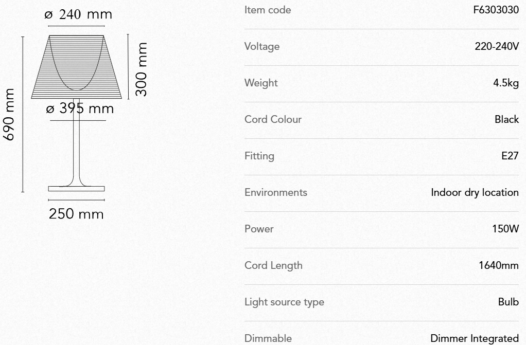 Lampebasen er laget av aluminium med en høypolert overflate, lampeskjermen er laget av pleksiglass og kan velges i helt gjennomsiktig eller røkfarget variant.