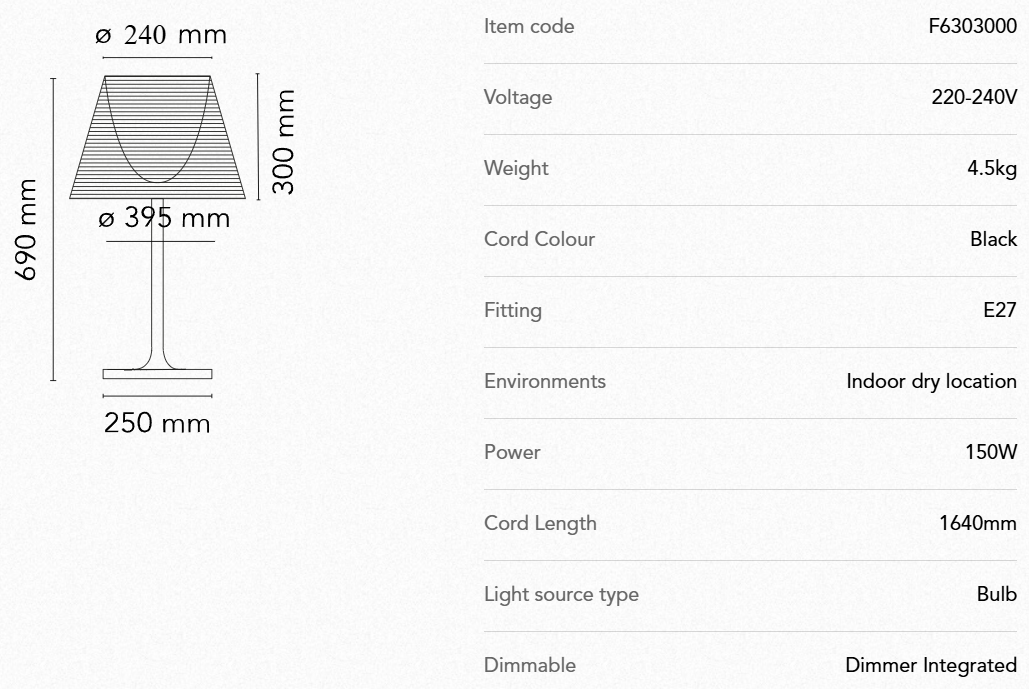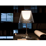 Lampebasen er laget av aluminium med en høypolert overflate, lampeskjermen er laget av pleksiglass og kan velges i helt gjennomsiktig eller røkfarget variant.