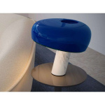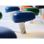 Lampeskjermen er laget av svart emaljert metall og sokkelen i hvit marmor. Lampen er utstyrt med en dimbar bryter. Snoopy gir direkte, myk belysning som reflekteres lett mot det lyse marmorgulvet.