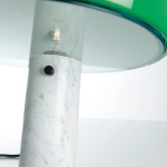 Lampeskjermen er laget av svart emaljert metall og sokkelen i hvit marmor. Lampen er utstyrt med en dimbar bryter. Snoopy gir direkte, myk belysning som reflekteres lett mot det lyse marmorgulvet.