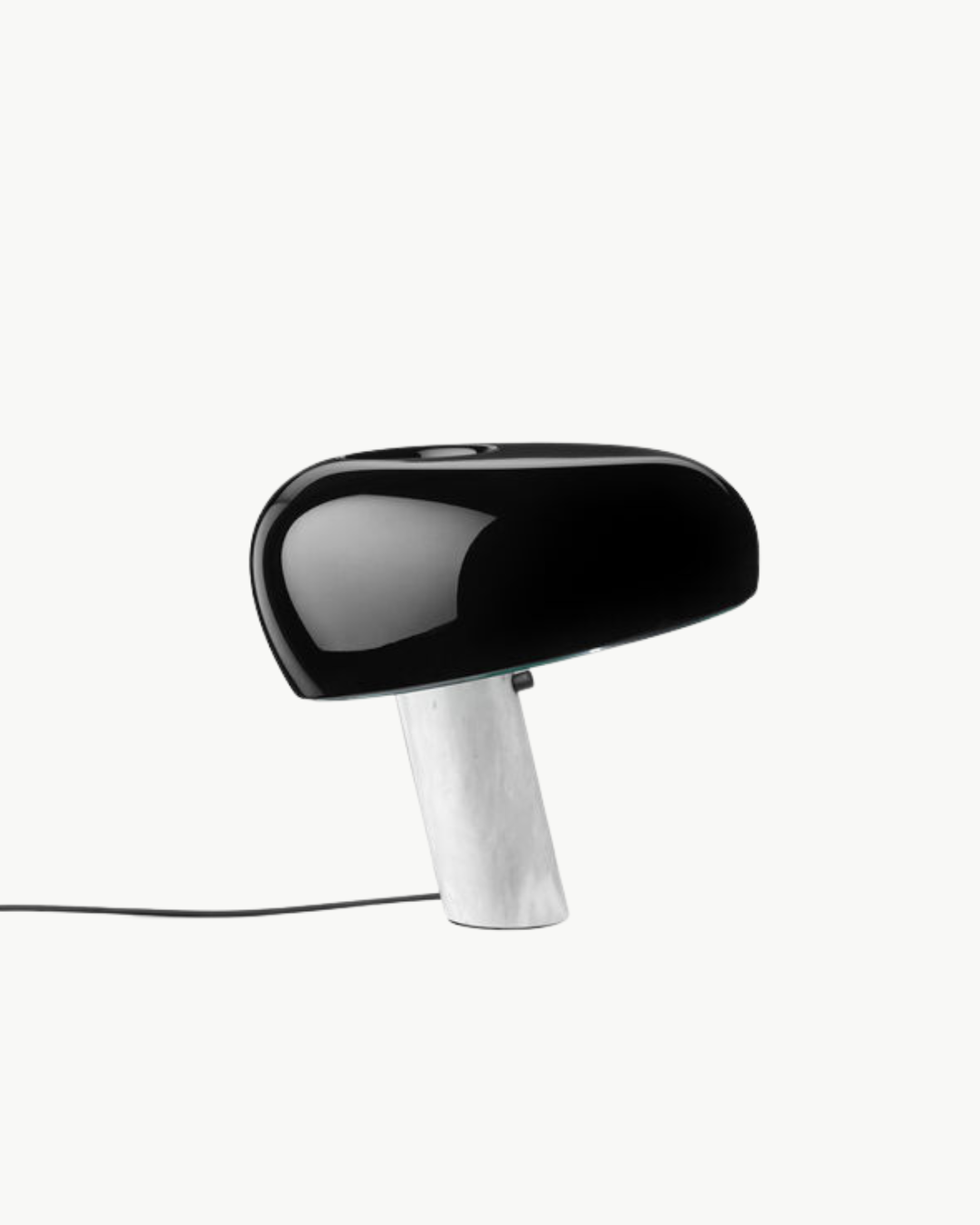 Designet av Achille & Pier Giacomo Castiglioni i 1967. Siden Snoopy table lamp ble designet har lampen blitt en moderne klassiker. Det lekne og elegante designet gjør at den passer inn i flere ulike interiørstiler. Snoopy passer på et skrivebord i et arbeidsrom eller på et sidebord i en stue og blir en tonesettende interiørdetalj i et hjem. Den unike formen er inspirert av den ikoniske tegneseriefiguren Snoopy. Lampeskjermen er laget av svart emaljert metall og sokkelen i hvit marmor. Lampen er utstyrt med en dimbar bryter.  Snoopy gir direkte, myk belysning som reflekteres lett mot det lyse marmorgulvet.
