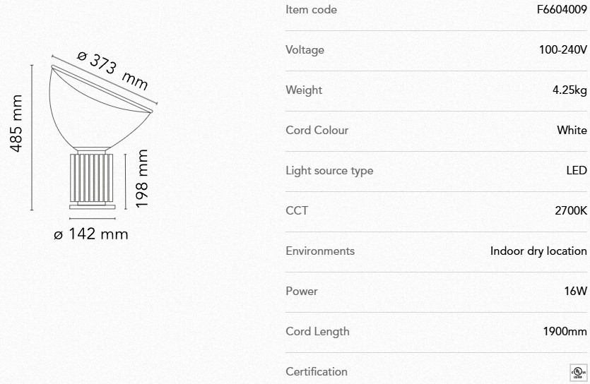Lampen gir indirekte og reflektert lys og er laget av aluminium, ABS-plast og glass. Elektrisk kabel med nyttig lengde 220 cm, med dimmerbryter for PÅ / AV og justering av lysstrømmen mellom 10-100%. Plug-in strømforsyning med utskiftbare plugger. Taccia er tilgjengelig i både liten og stor utgave.