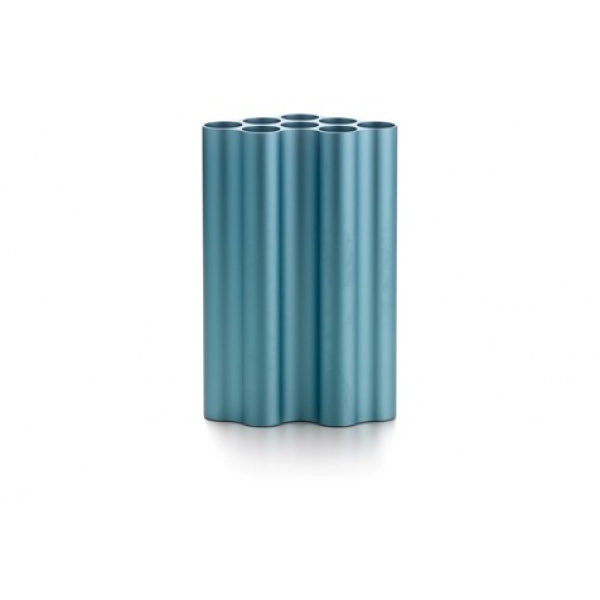 The shape of the Nuage vases made its first appearance in the oeuvre of Ronan and Erwan Bouroullec in 2002. Reminiscent of a cloud, it was originally produced as a plastic shelf module that can be grouped into clusters or large-scale configurations. Eight tubular cavities pierce the flat surfaces of the modular element while also defining the form's outer contours. Over the years, the Bouroullec brothers have varied this shape and repeatedly incorporated it in their graphic work. For the Nuage vase, the designers executed the cloud motif in extruded aluminium profiles of varying lengths. The cavities in the basic form are now positioned upright, dividing the vase into eight individual tubes that can be used for the artful arrangement of flowers and grasses. The undulating surfaces, with an anodised finish in various colours, produce an attractive interplay of light and shadow. Thanks to their precise outer contours, the vases can be fitted together to create entire 'cloud formations'. Material: anodised aluminium, rubber stoppers