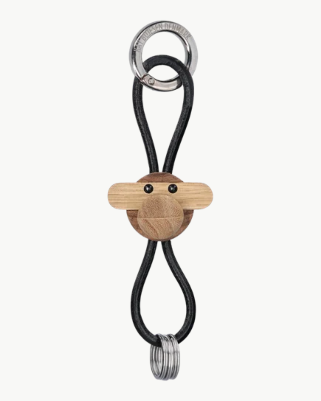 Ta med deg Kay Bojesens elskede klassikere og din kjærlighet til originalt dansk design overalt. På vesken. På beltet. Eller på bilnøkkelen. Denne Kay Bojesen-nøkkelringen har apens karakteristiske hode laget i den velkjente komposisjonen av oljet tre i FSC®-sertifisert teak og kontrollert limba, og leveres med en både estetisk og smart svart snor i ekte skinn som kan beveges opp og ned i forhold til figuren, slik at du kan skape ditt eget uttrykk. Øverst finner du en stor sølvfarget nøkkelring trykt med Kay Bojesen Denmark, som i tillegg til å være vakkert dekorert også er utstyrt med en praktisk karabinkrokfunksjon som er enkel å åpne og lukke, og nederst under figuren henger tre ekstra nøkkelringer, slik at du har god plass til alle nøklene dine. Med en smart og dekorativ nøkkelring fra Kay Bojesen Denmark kan du enkelt og stilig gjøre hverdagen mer personlig og ta med deg originalt dansk design på farten, uavhengig av om du fester denne varianten med den legendariske apen eller den klassiske sangfuglen som din evig trofaste makker. Kay Bojesen var en mester i å legge til små detaljer i sine tredesign. Han fant magien i naturens eget materiale, og med sitt unike designtalent vokste den ene forunderlige figuren etter den andre ut av fantasien hans og tok form mellom hendene hans. To av hans største klassikere er utvilsomt apen og sangfuglen. Og selv om apen i denne nøkkelringutgaven er nedskalert i volum til en høyde på bare 3 cm, får du fortsatt med deg mye av Kay Bojesens designarv, uansett hvor du går. Kay Bojesen skapte sin første trefigur i 1922 og åpnet ti år senere en butikk og et verksted i Bredgade i København. Siden den gang har Kay Bojesen vært synonymt med original dansk design og et fantasifullt univers av ikoniske trefigurer, skapt med et skarpt øye for detaljer basert på humor og gleden ved unikt trehåndverk av høyeste kvalitet. Derfor sier vi at Kay Bojesen er original siden 1922. Nøkkelringen leveres i en gjenbrukbar non-woven pose og forsynes med en Kay Bojesen-merkelapp.