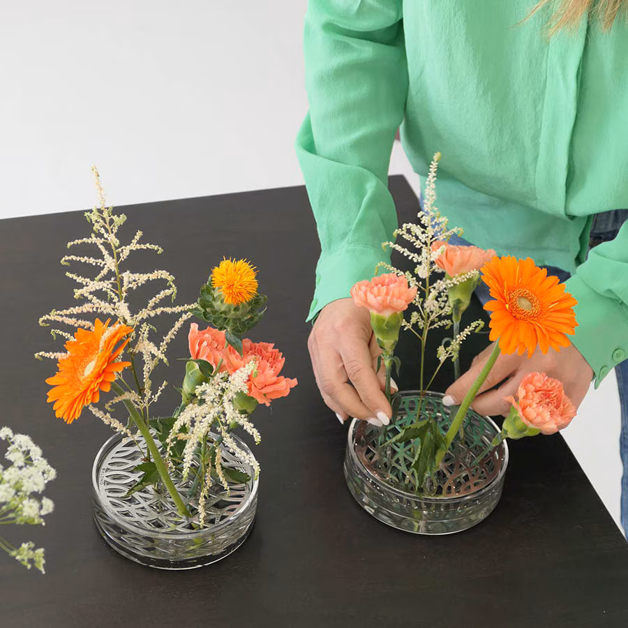 Äng vase, stor fra KLONG er en elegant vase fra Äng-kolleksjonen designet av Eva Schildt. Den håndlagde metallstativet fungerer som en innebygd blomsterstøtte og gir snittblomstene dine støtte og vakker struktur. Hver vase får et unikt uttrykk da mønsteret er formet for hånd, noe som gjør hvert eksemplar spesielt sjarmerende. Messingen er lakkert for å tåle vann — rengjør grundig for planteesaft og skift blomstevannet ofte for å bevare finishen. Perfekt for den som vil løfte blomstene til en varm, skandinavisk detalj i hjemmet.