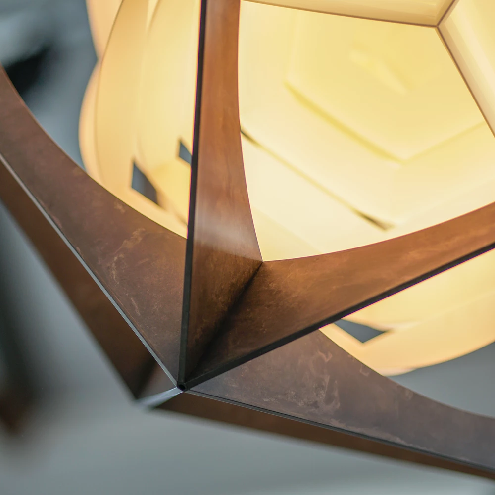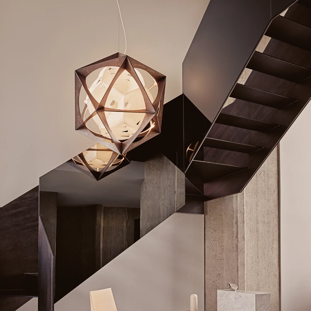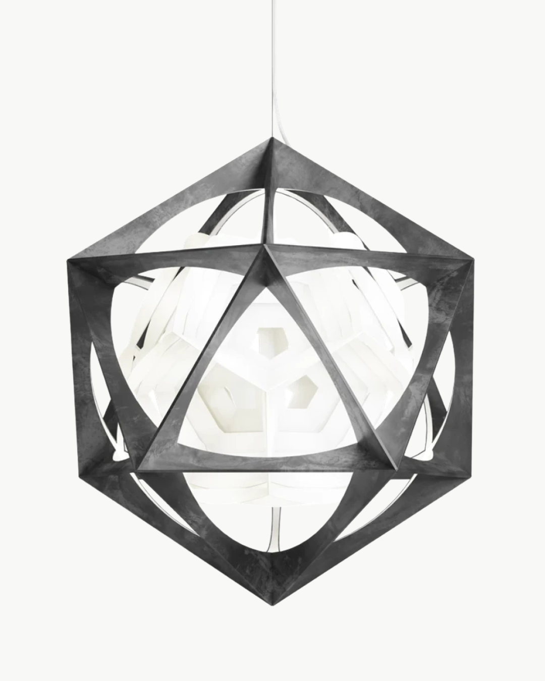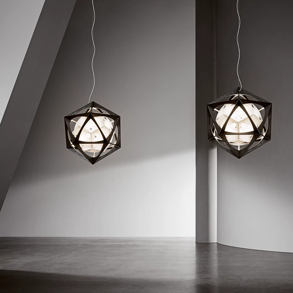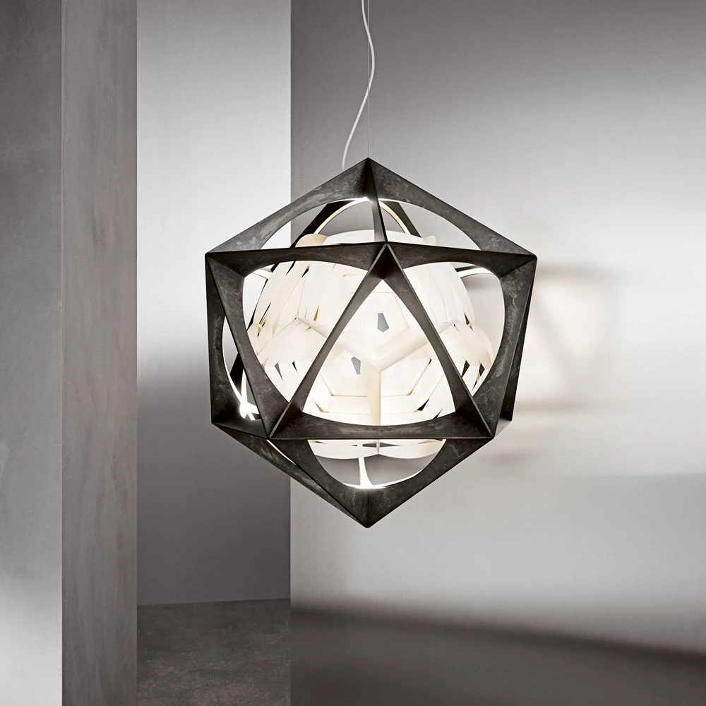 Pendelen er satt sammen av to kontrastfylte, men sammenkoblede geometriske former. Det ytterste laget er en stiv aluminiumsramme i form av et ikosaeder med 20 trekantede sider. Den indre formen ser ut til å sveve i rammen, og den består av en hvit polykarbonatreflektor med geometrisk form som et dodekaeder med 12 femkantede sider.