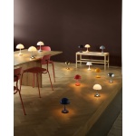 Lampen Panthella 160 Portable er en nedskalert versjon av den opprinnelige designen. Lampen er kun 160 mm i diameter, noe som gjør den perfekt for å ta med seg både innendørs og utendørs for å skape en flott stemning.