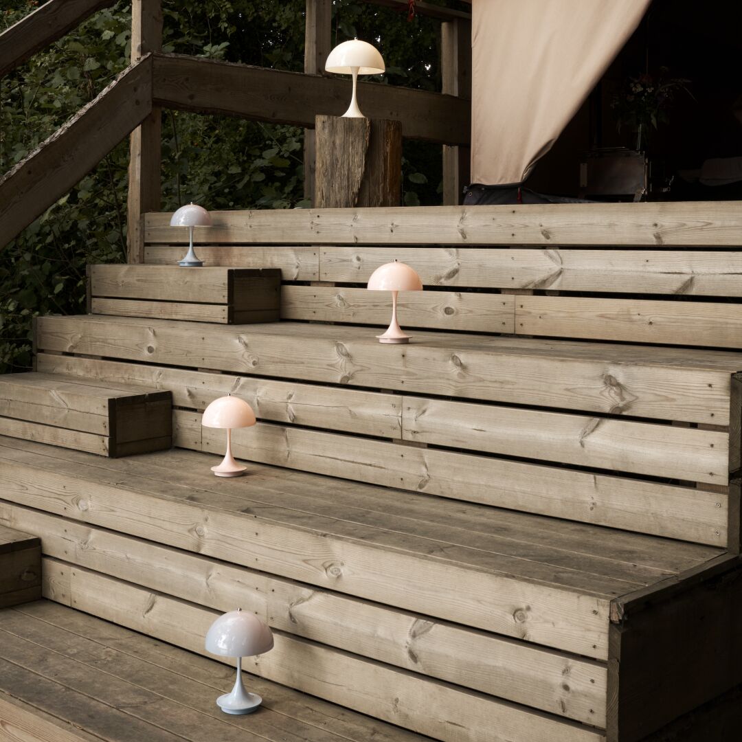 Lampen Panthella 160 Portable er en nedskalert versjon av den opprinnelige designen. Lampen er kun 160 mm i diameter, noe som gjør den perfekt for å ta med seg både innendørs og utendørs for å skape en flott stemning.