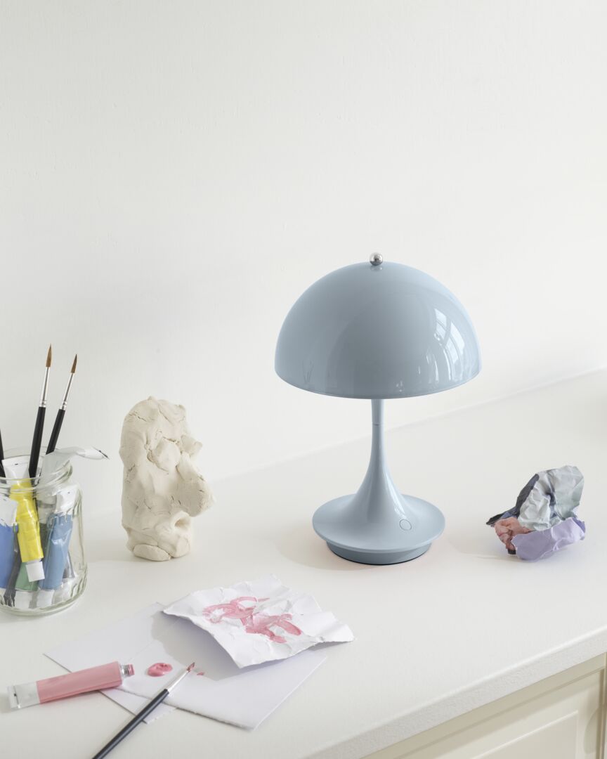 Panthella lampedesign er én av Verner Pantons mest betydningsfulle design, og gjenspeiler den danske arkitektens storslåtte personlighet. Han ønsket å skape en organisk formet lampe som gir 100 % blendefritt lys, der både stativet og skjermen fungerer som lysreflektorer. Panton lyktes med å lage lampen Panthella i samarbeid med Louis Poulsen i 1971. Lampens karakteristiske form og evne til å reflektere mykt lys fra den trompetformede sokkelen har vært med på å gi den status som et designikon. Lampen Panthella 160 Portable er en nedskalert versjon av den opprinnelige designen. Lampen er kun 160 mm i diameter, noe som gjør den perfekt for å ta med seg både innendørs og utendørs for å skape en flott stemning.