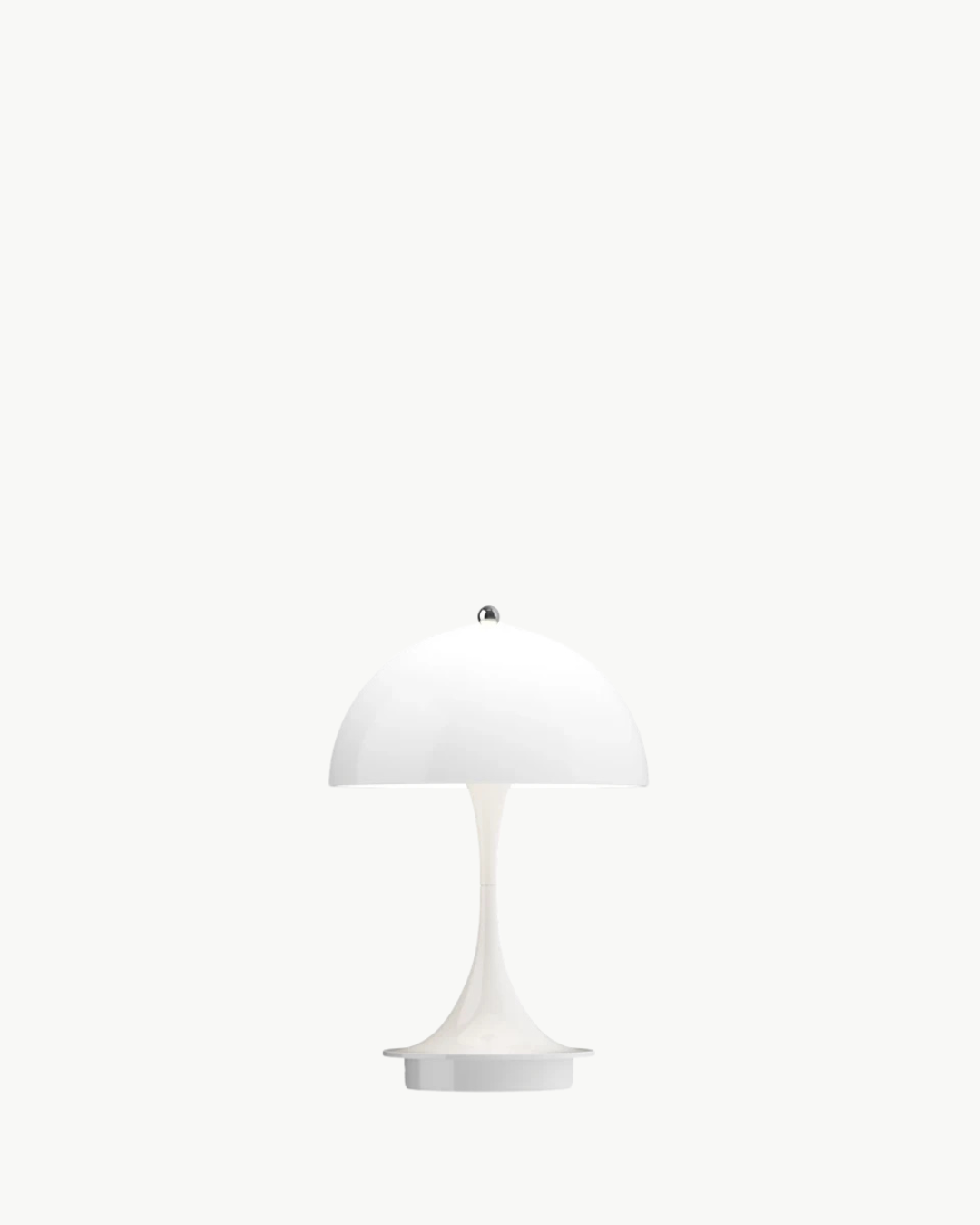 Panthella lampedesign er én av Verner Pantons mest betydningsfulle design, og gjenspeiler den danske arkitektens storslåtte personlighet. Han ønsket å skape en organisk formet lampe som gir 100 % blendefritt lys, der både stativet og skjermen fungerer som lysreflektorer. Panton lyktes med å lage lampen Panthella i samarbeid med Louis Poulsen i 1971. Lampens karakteristiske form og evne til å reflektere mykt lys fra den trompetformede sokkelen har vært med på å gi den status som et designikon. Lampen Panthella 160 Portable er en nedskalert versjon av den opprinnelige designen. Lampen er kun 160 mm i diameter, noe som gjør den perfekt for å ta med seg både innendørs og utendørs for å skape en flott stemning.