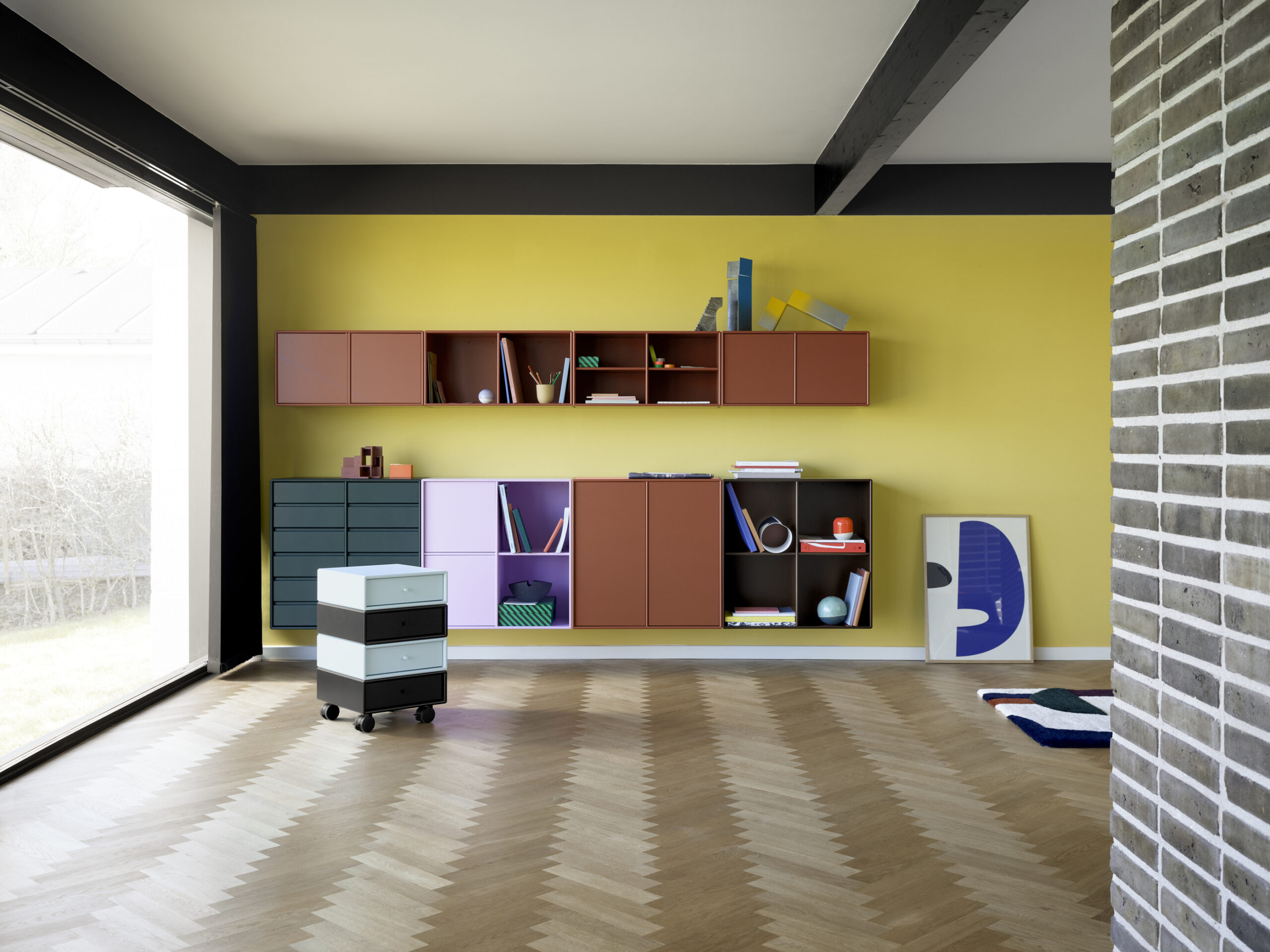 SHOW er tilgjengelig med opphengsskinner, sokkel (3 eller 7 cm) og ben. Velg mellom 41 Montana lakkfarger.