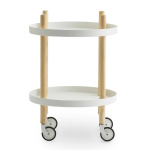 Block Table Ø45 cm, designet av Simon Legald for Normann Copenhagen, er et allsidig møbel som passer inn i de fleste miljøer. Bordet har hjul som er nøye fargetilpasset til flisene og kan rotere 360° for enkel manøvrering. En svart nylonring rundt hjulene gir bedre grep og økt stabilitet, slik at bordet står stødig under bruk. De integrerte håndtakene gjør det enkelt å flytte bordet mellom rom, og det leveres flatpakket med monteringsanvisning for enkel montering. Hver hylle tåler opptil 10 kg, noe som gjør bordet både praktisk og funksjonelt i mange ulike sammenhenger.