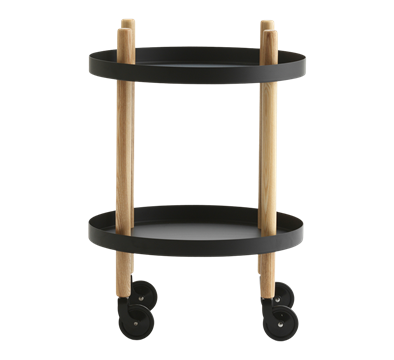 Block Table Ø45 cm, designet av Simon Legald for Normann Copenhagen, er et allsidig møbel som passer inn i de fleste miljøer. Bordet har hjul som er nøye fargetilpasset til flisene og kan rotere 360° for enkel manøvrering. En svart nylonring rundt hjulene gir bedre grep og økt stabilitet, slik at bordet står stødig under bruk. De integrerte håndtakene gjør det enkelt å flytte bordet mellom rom, og det leveres flatpakket med monteringsanvisning for enkel montering. Hver hylle tåler opptil 10 kg, noe som gjør bordet både praktisk og funksjonelt i mange ulike sammenhenger.