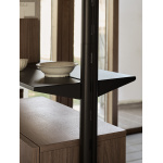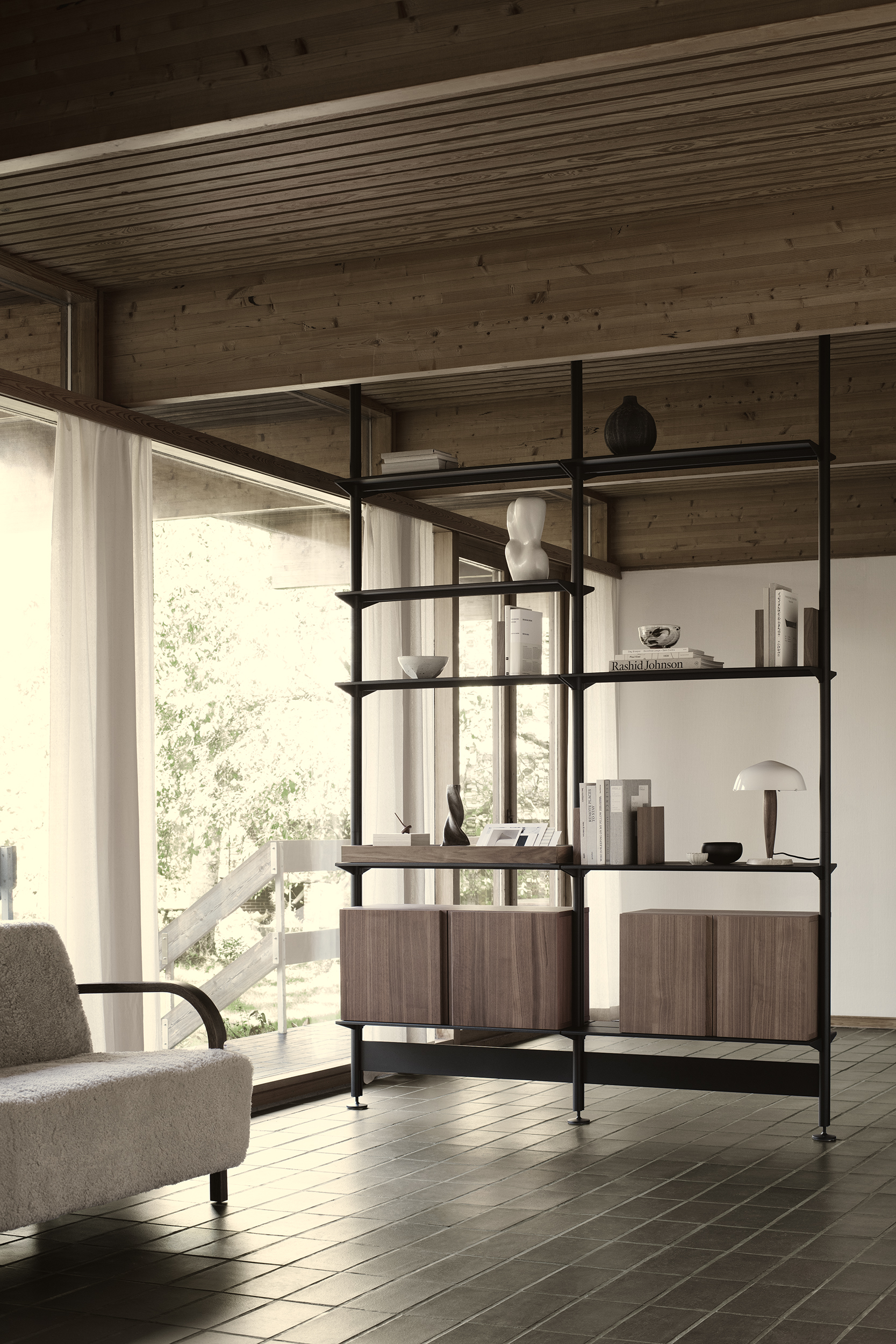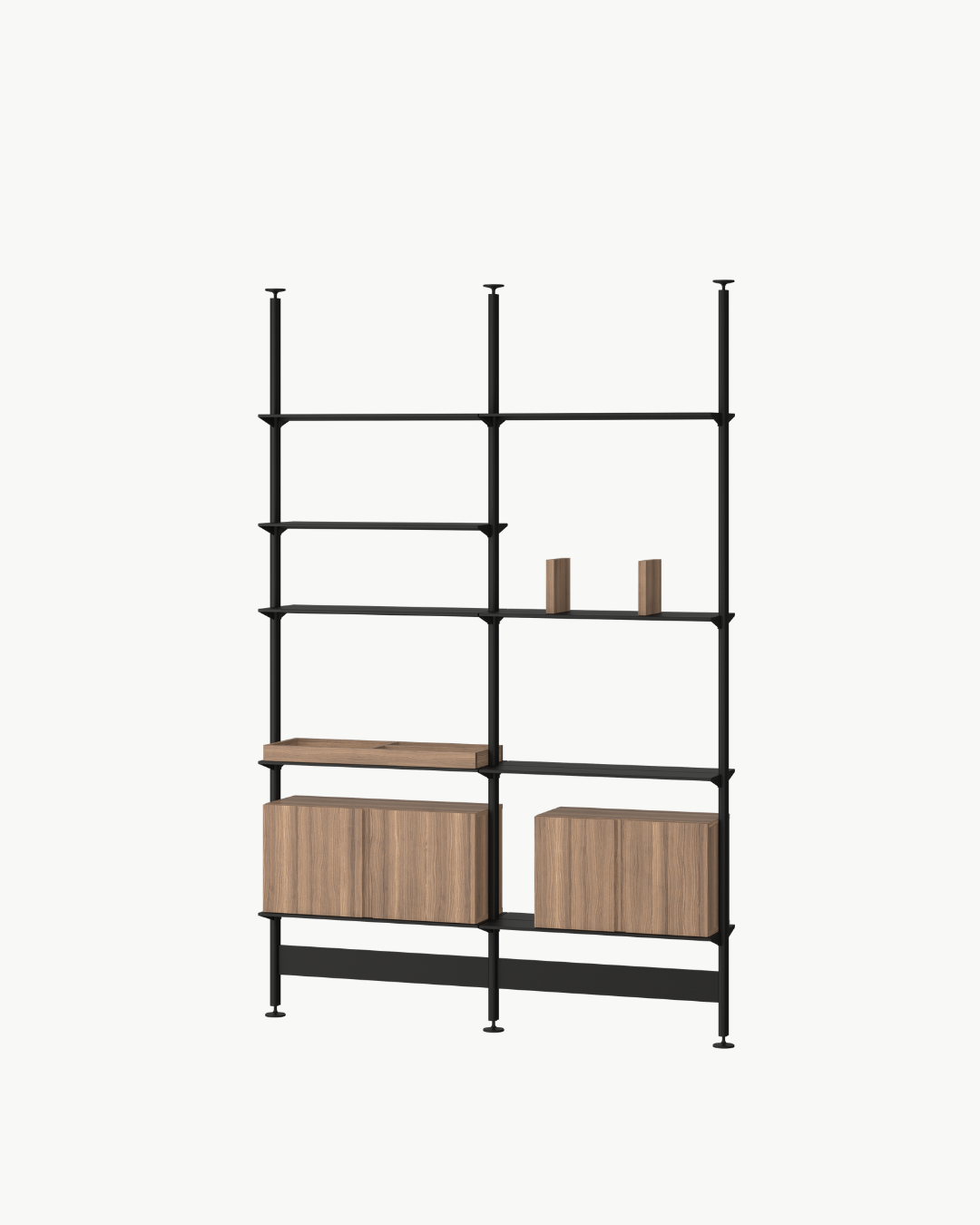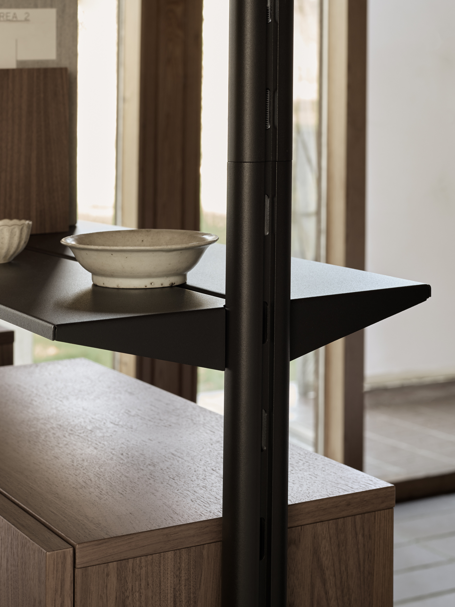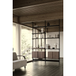 Hyllesystemet kombinerer treverk, lakkerte stålhyller og slanke aluminiumsstolper, noe som gir et uttrykk som både er robust og elegant.