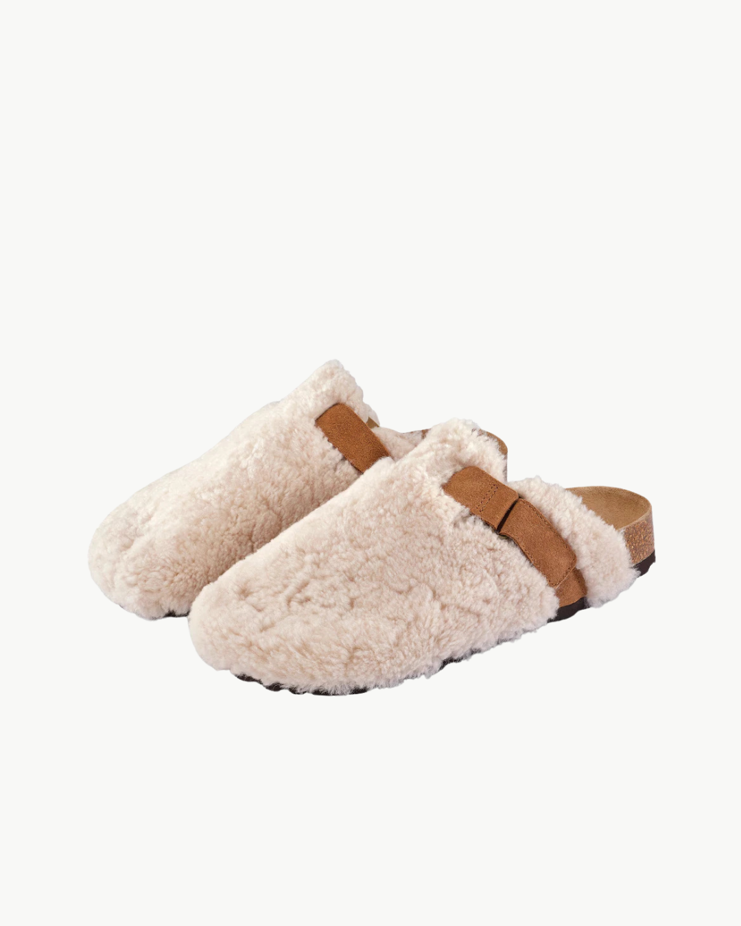 Tøfler i deilig saueskinn med regulerbar rem med borrelåslukking på oversiden. Fotformet såle i kork kledd som gjør tøflene naturlig pustende. Yttersåle i EVA for lav vekt og støtdemping.